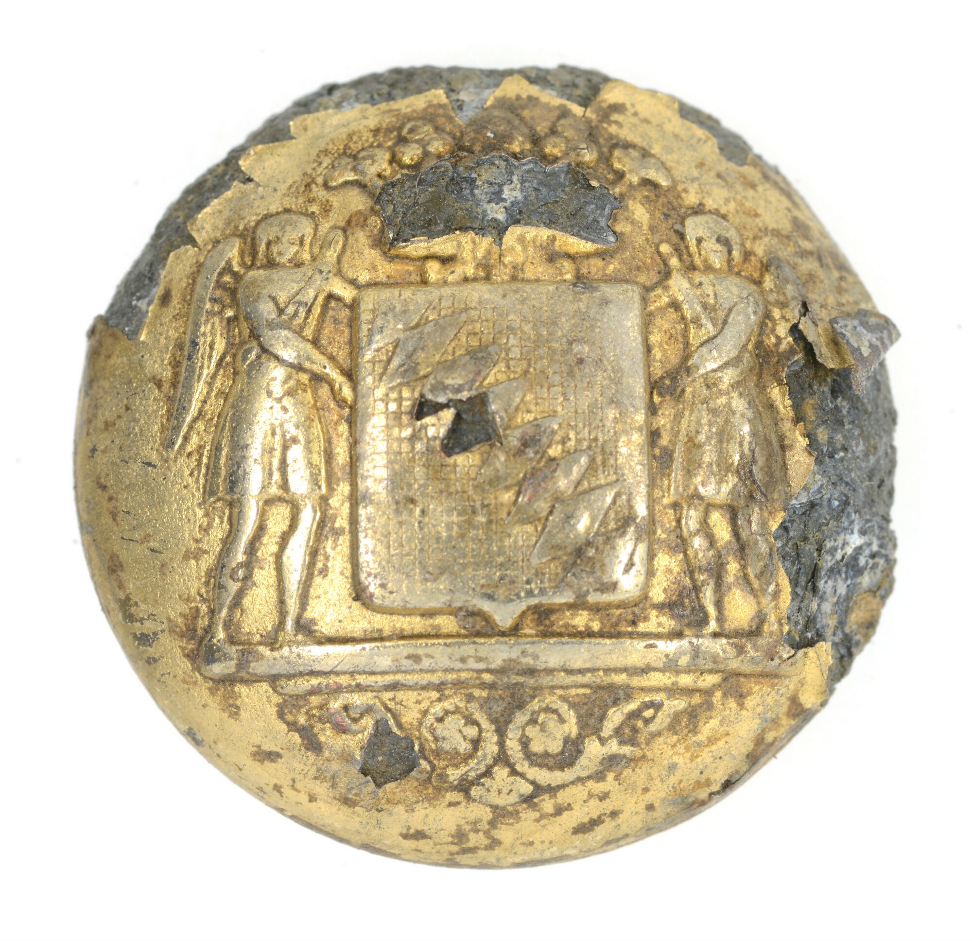 Knoop; gekroond wapenschild met acht schuin geplaatste ruiten, 2 engelen als schilddragers