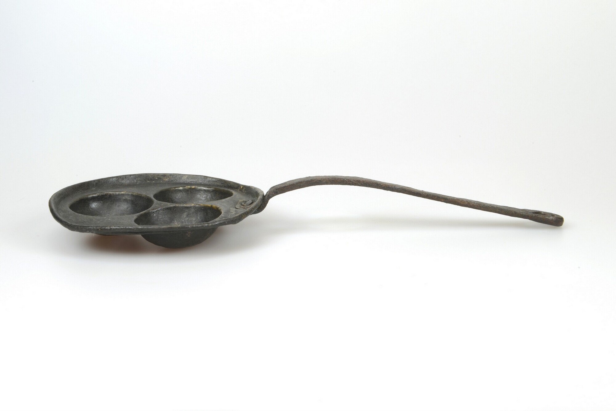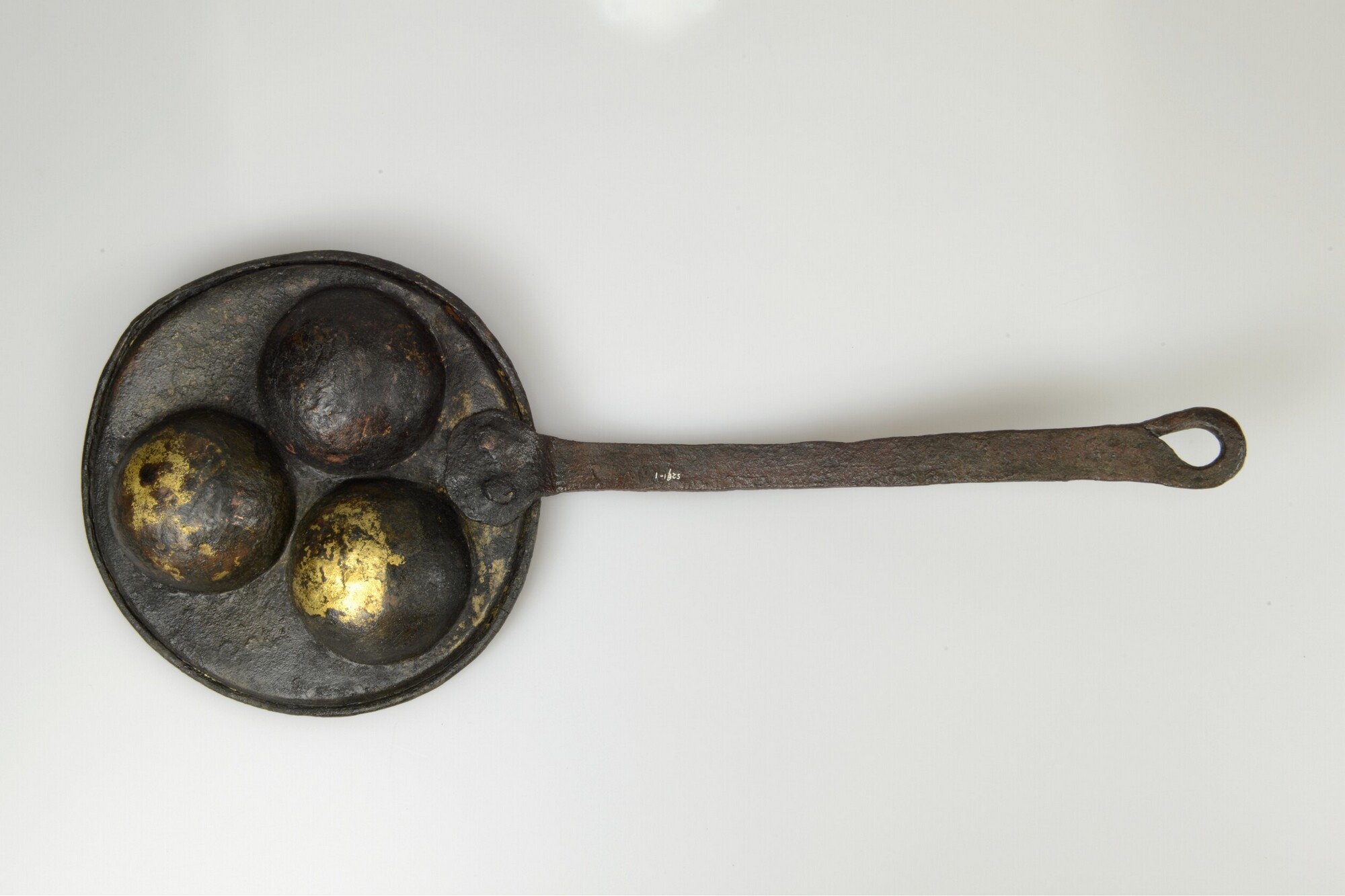 Steelpan; evenveeltjespan; ronde bak van vertind messing met drie uithollingen en een licht gebogen ijzeren steel met ophangoog; vondstomstandigheden: uit waterput