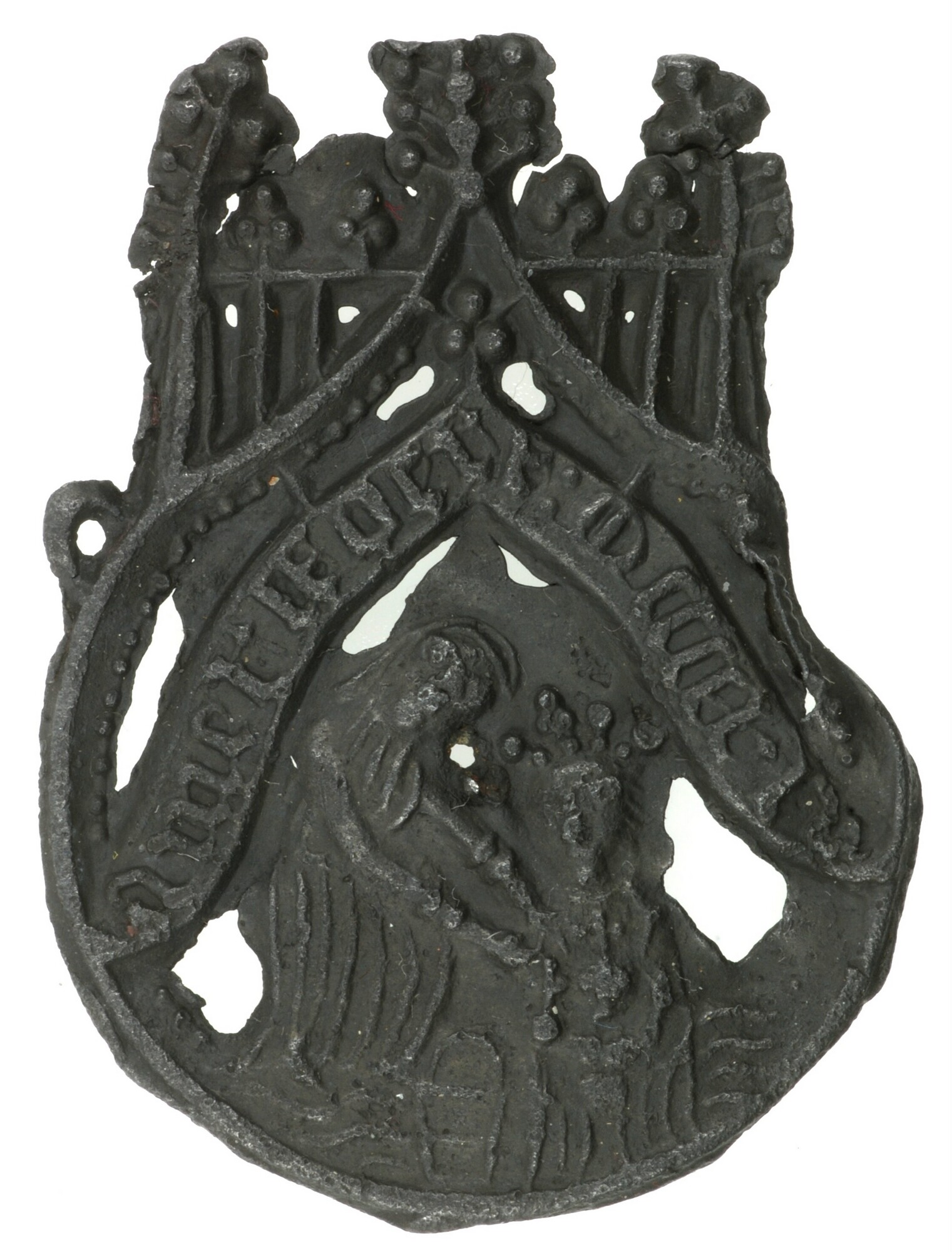 Insigne; voorstelling van de vondst van het wonderbaarlijke Mariabeeld uit Amersfoort; links is een knielende vrouw (Margriete) afgebeeld die een in verhouding nogal groot Mariabeeld uit het water haalt; banderol boven de voorstelling met de tekst: AMERSFOERT MCCCCXLV (1445); bekroning van een gotisch maaswerk; ophangoogje aan één zijde (andere zijde ontbreekt)