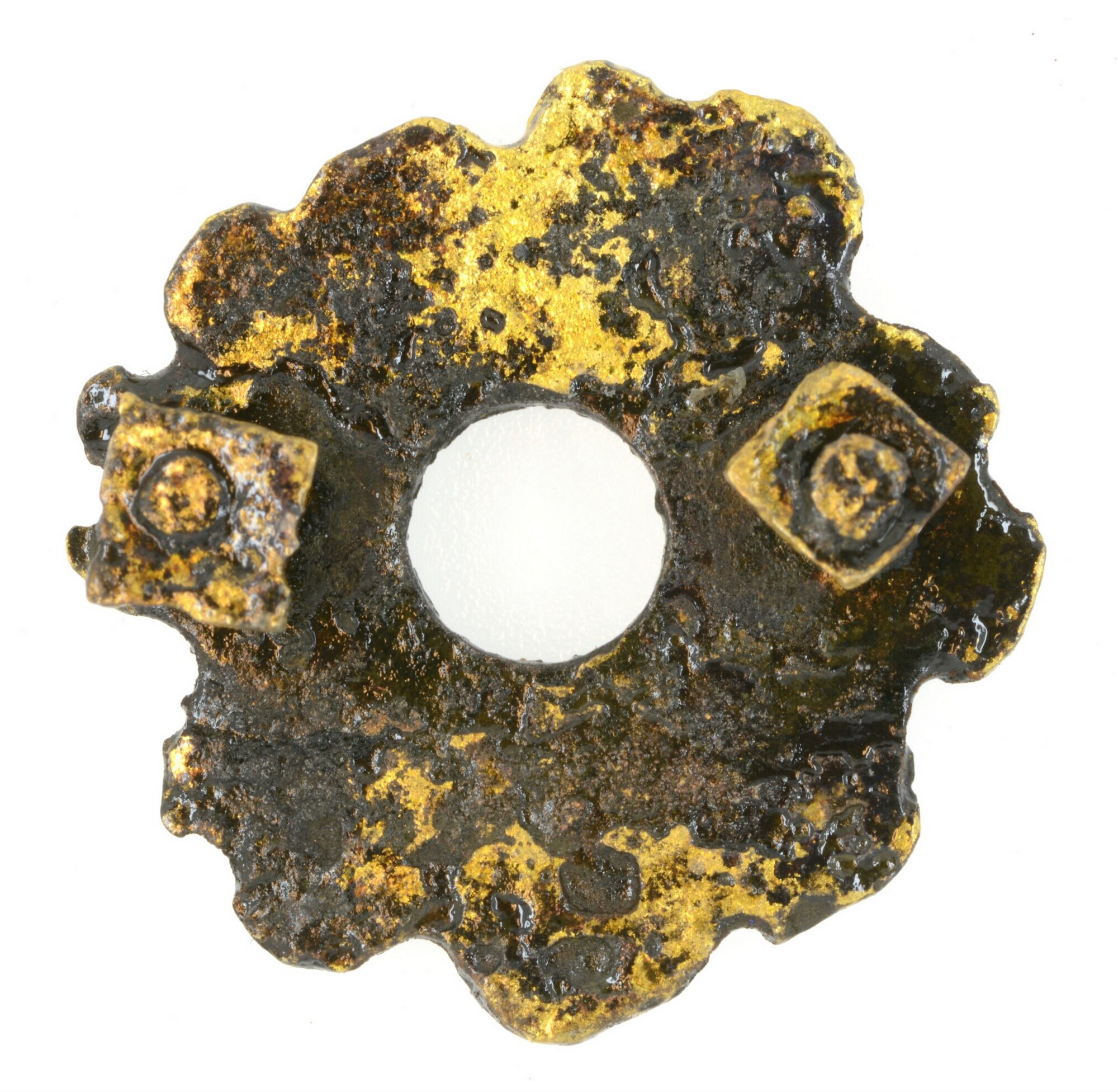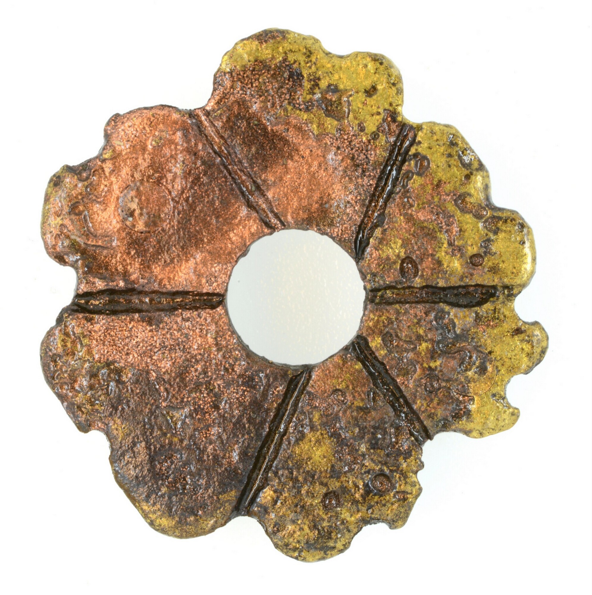 Riembeslag; bloemvormig met zes bloemblaadjes en twee bevestigingslipjes aan de achterzijde