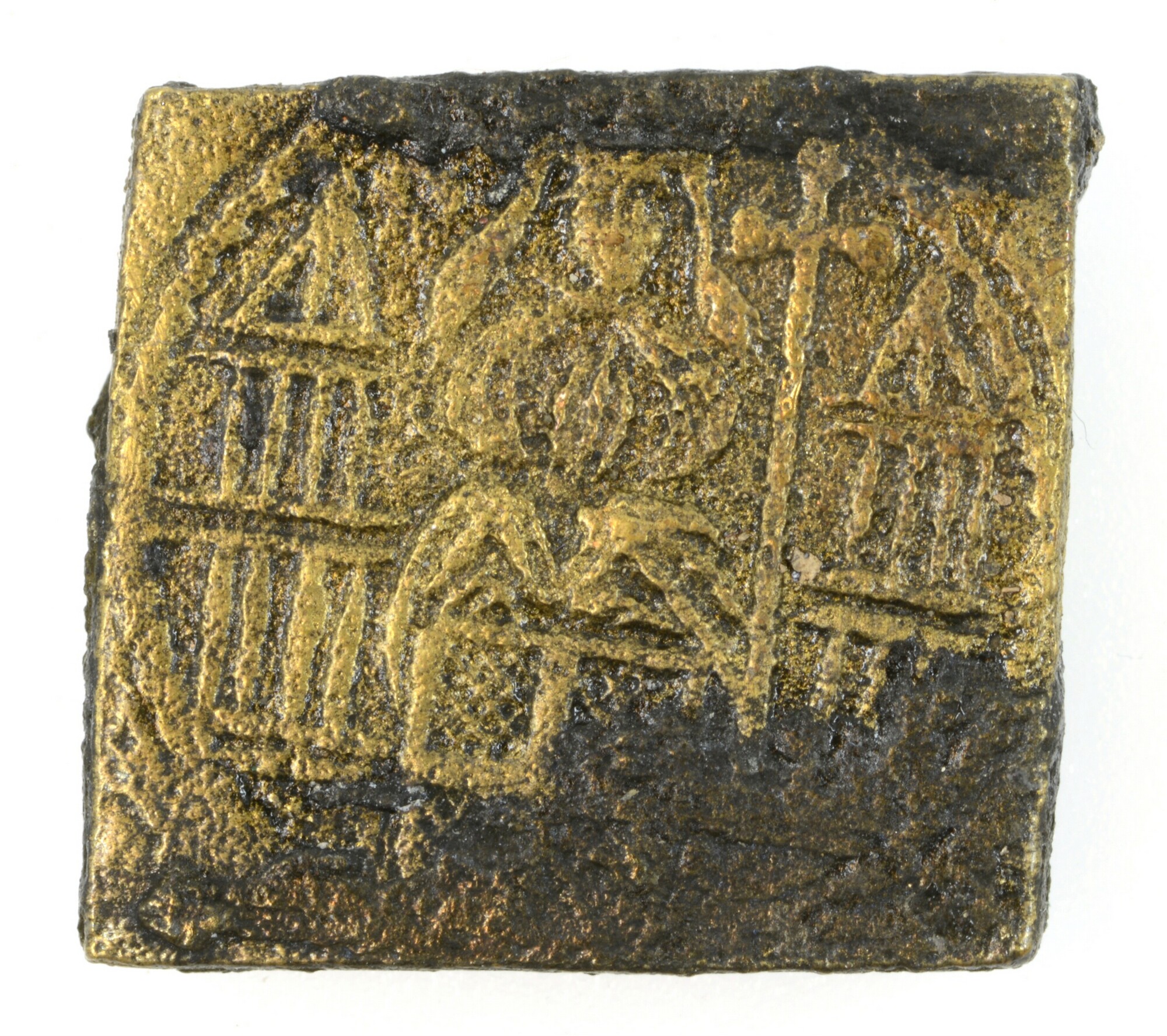 Muntgewicht Davidsgulden; vz.: een koning op een troon met aan zijn linkerzijde het christelijk kruis; kz.: een hand met de letters LM; gewicht: 3.13 gram; herkomst: Antwerpen