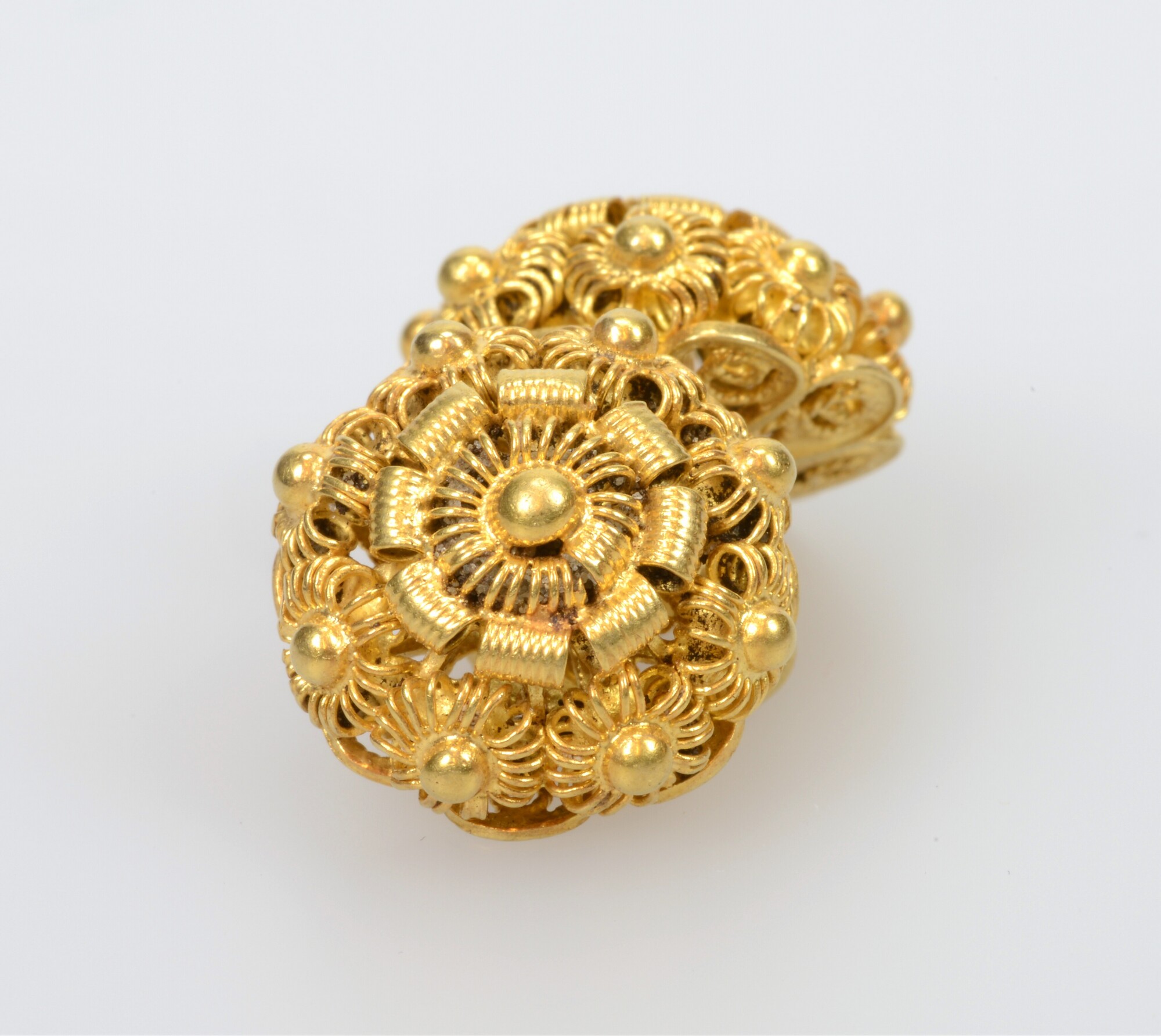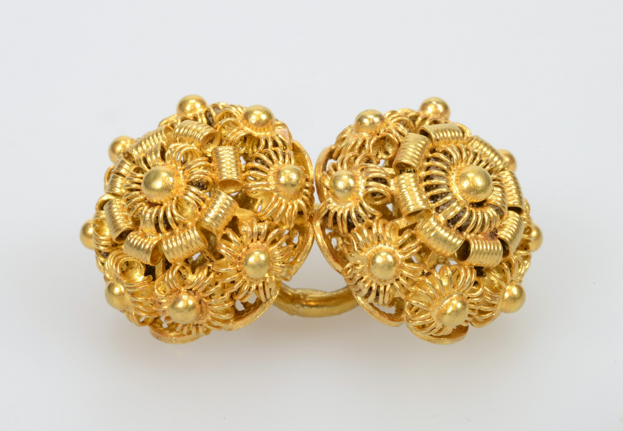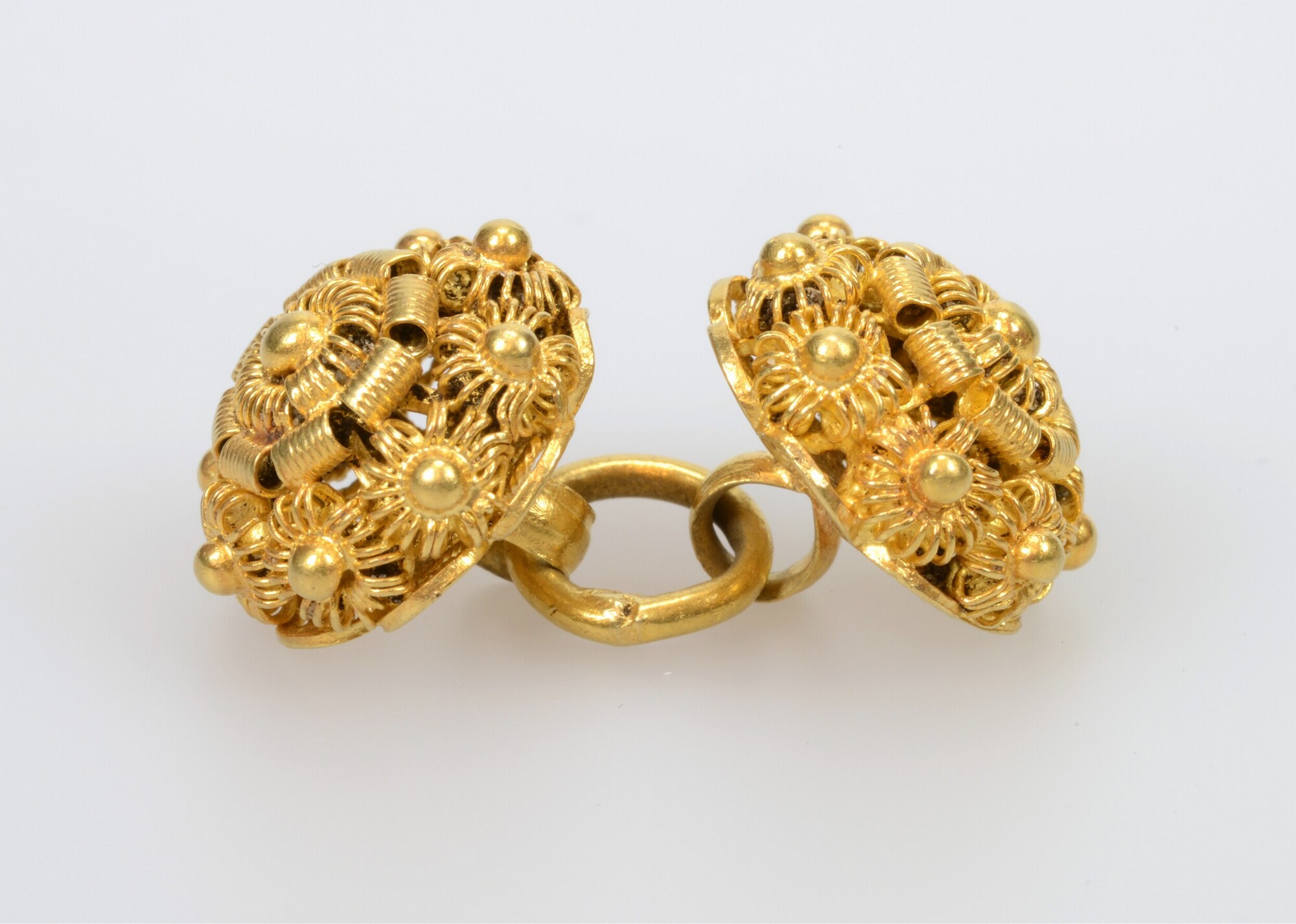 Keelknoop; twee knopen filigrain versierd met Zeeuwse knoppen en gouddraad; de knopen zijn met een gouden schakel aan elkaar verbonden; gewicht: 11 gram; vondstomstandigheden: graf 25
