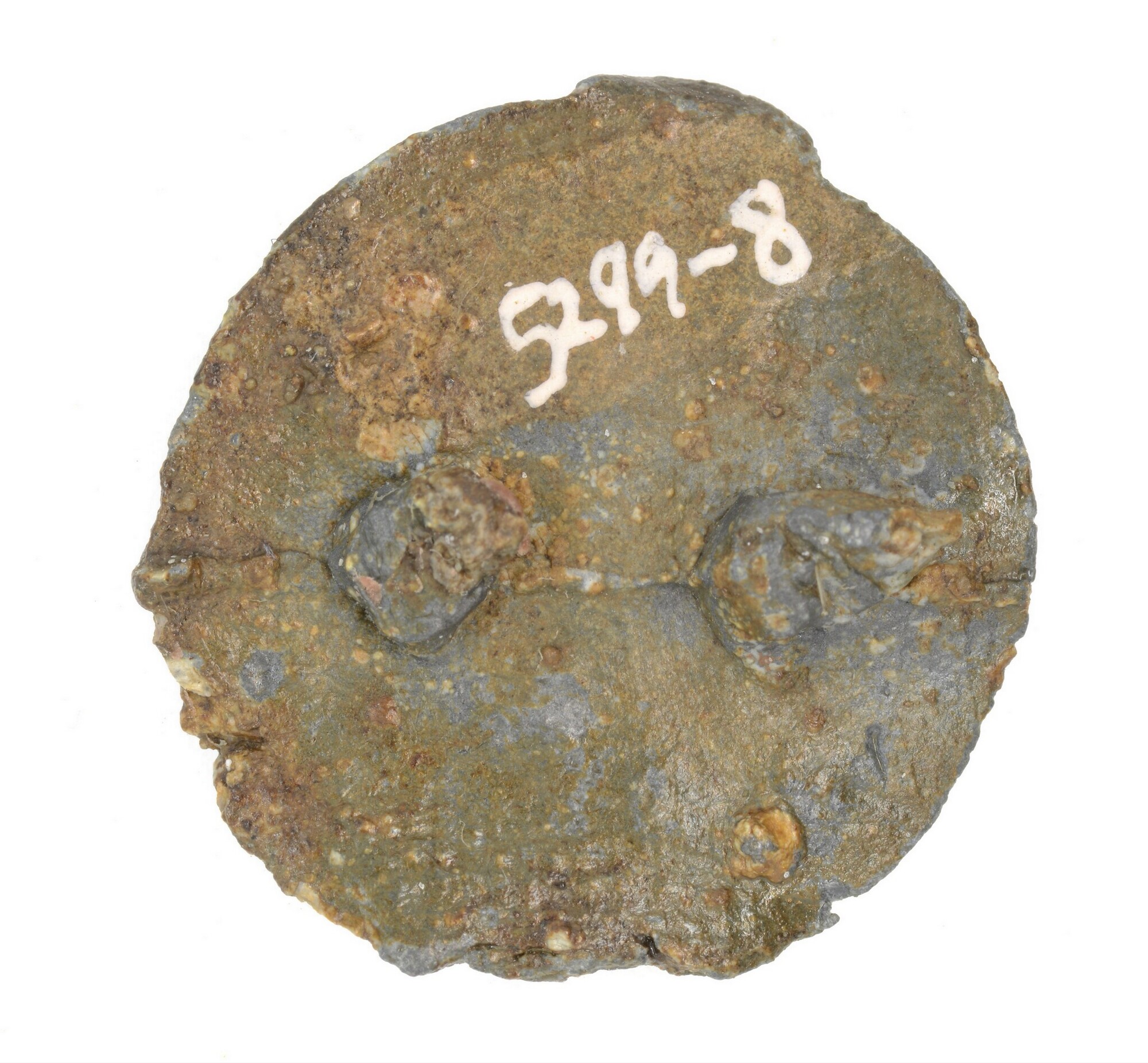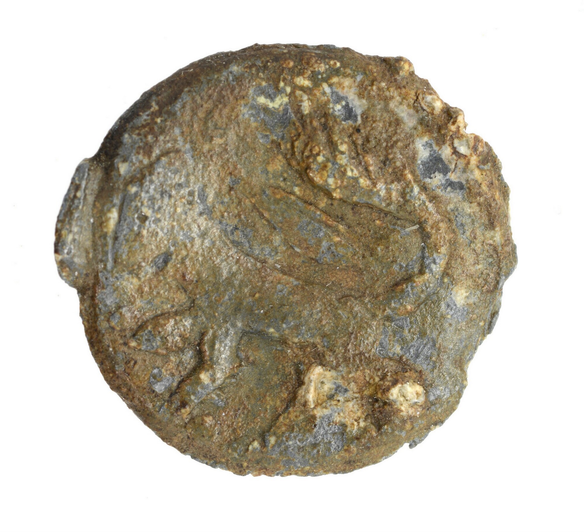 Knoop of muntspeld; vz: klimmende-leeuw motief; kz: 2 bevestigingspunten voor draagspeld(?); gewicht: 3.01 gram