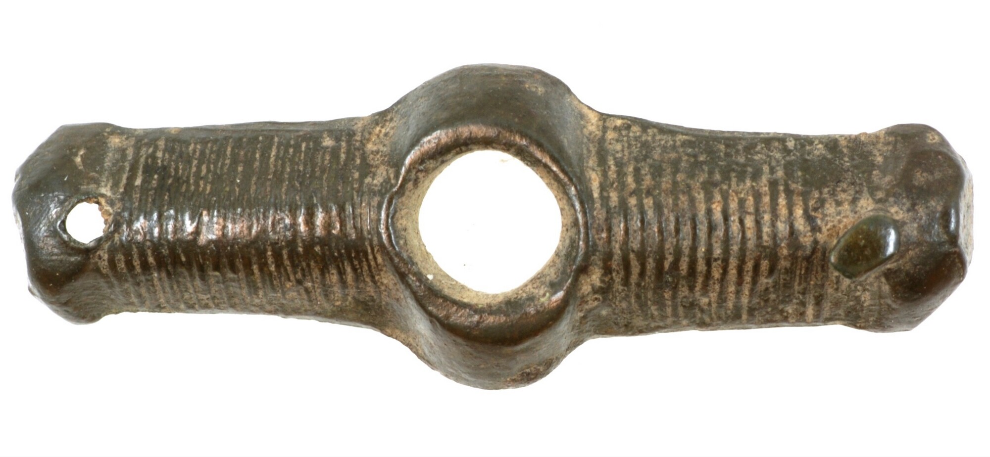 Riembeslag; een nageltje zit een van de twee oogjes; identiek aan 5299-0055; gewicht: 1.99 gram