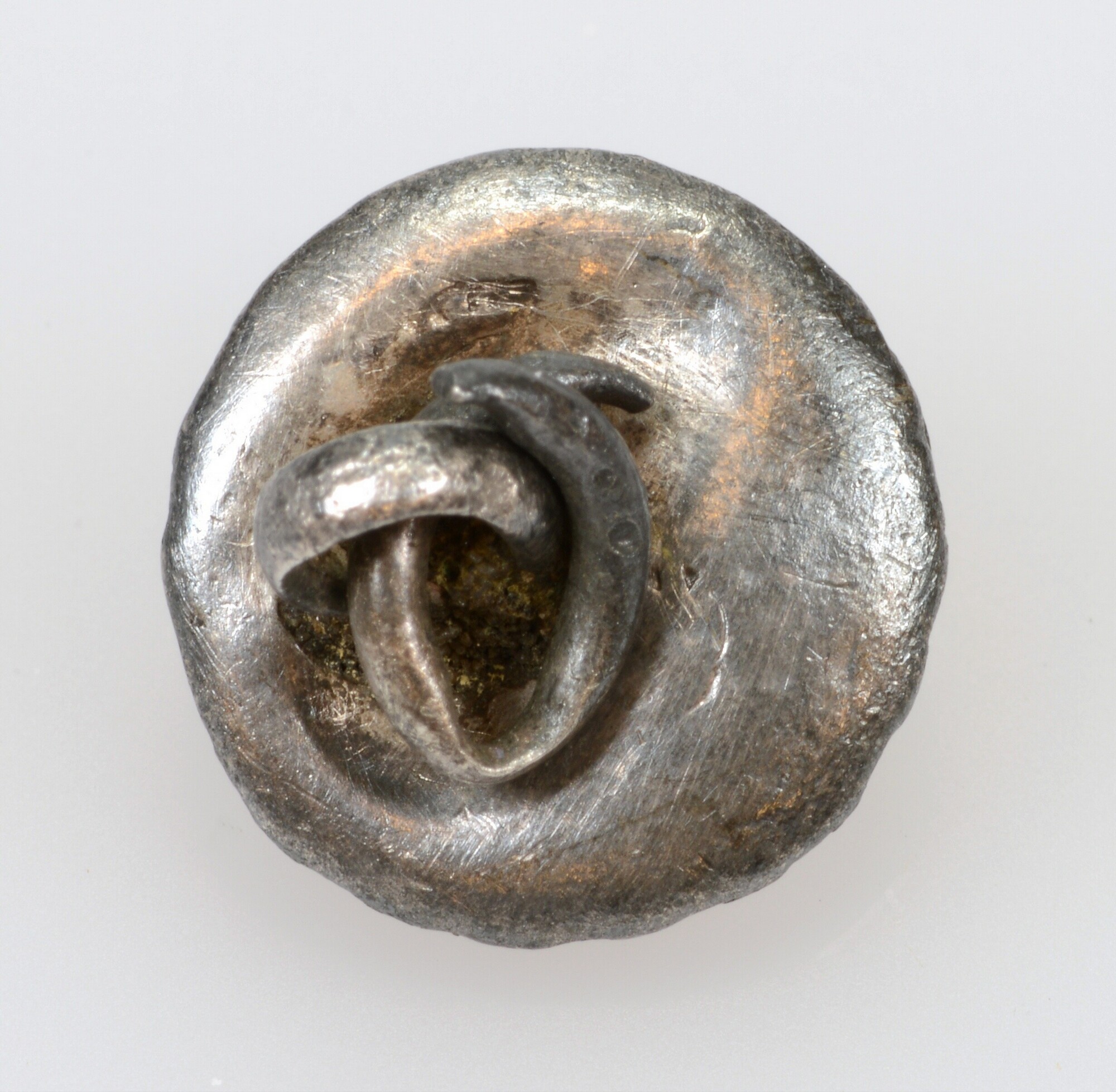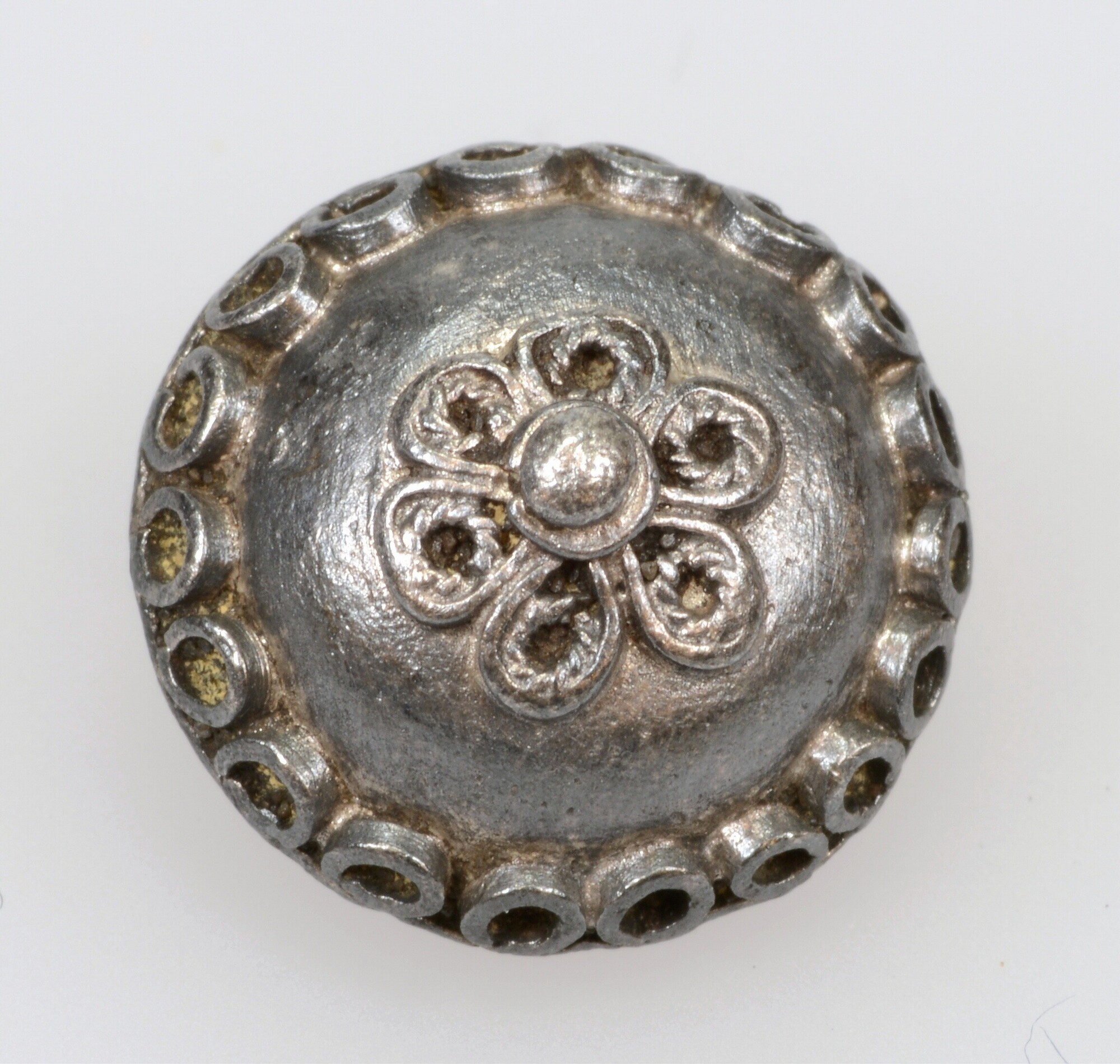 Keelknoop; draadoog; vz: bloem motief; kz: leeg; haakje door oog; gewicht: 1.76 gram