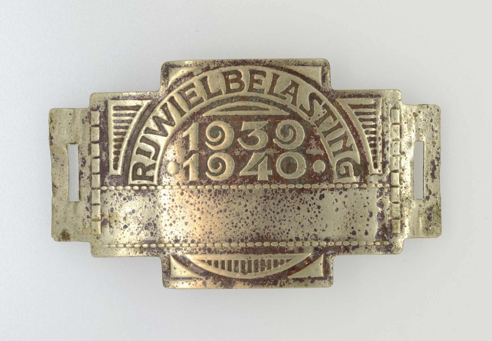 Rijwielbelastingplaatje; rechthoekig, kruisvormig; met aan beide uiteinden rechthoekige uitsparingen om het plaatje op te hangen aan de fiets; vz: 1939-1940 binnen een halve cirkel met daarin RIJWIELBELASTING; gewicht: 3.68 gram