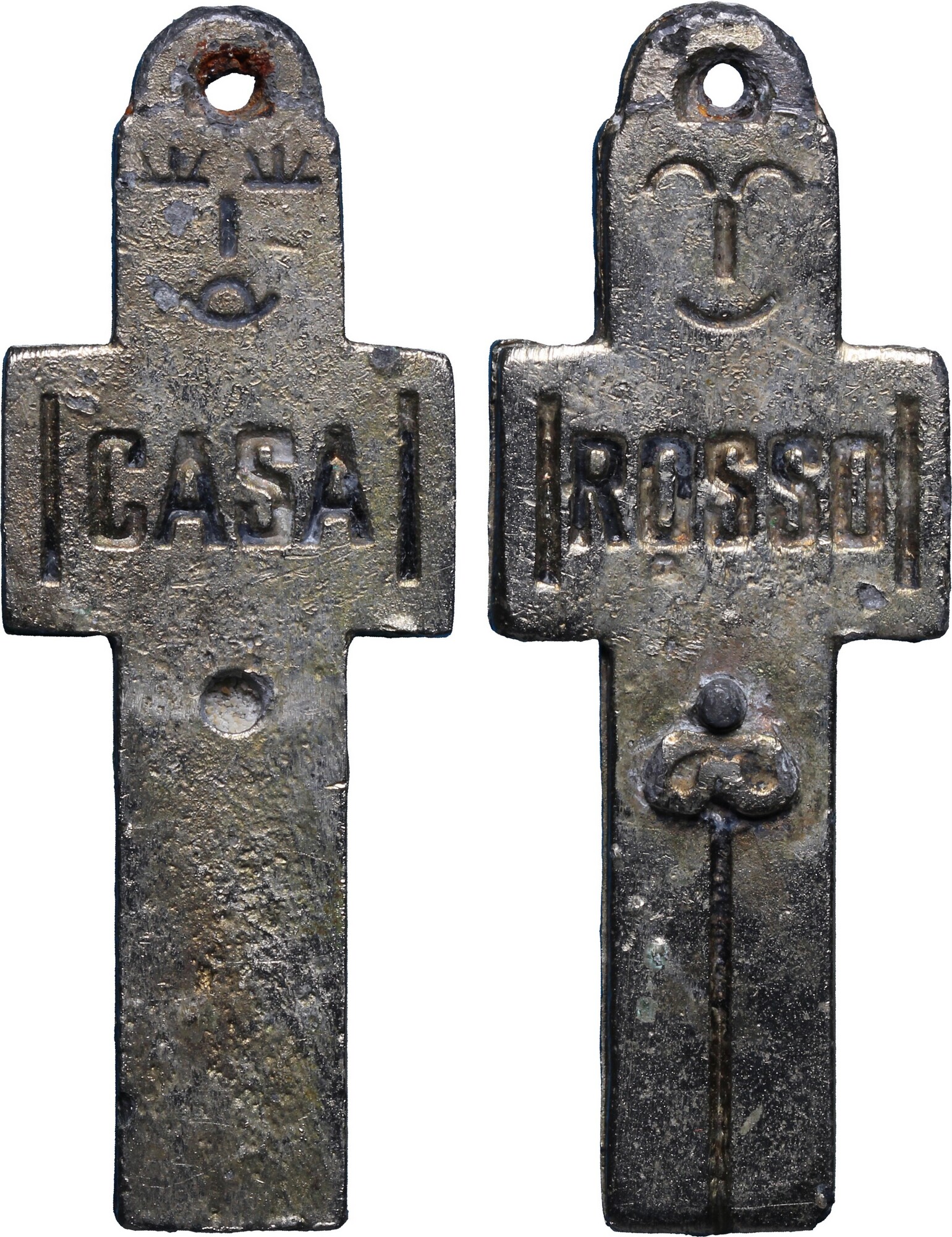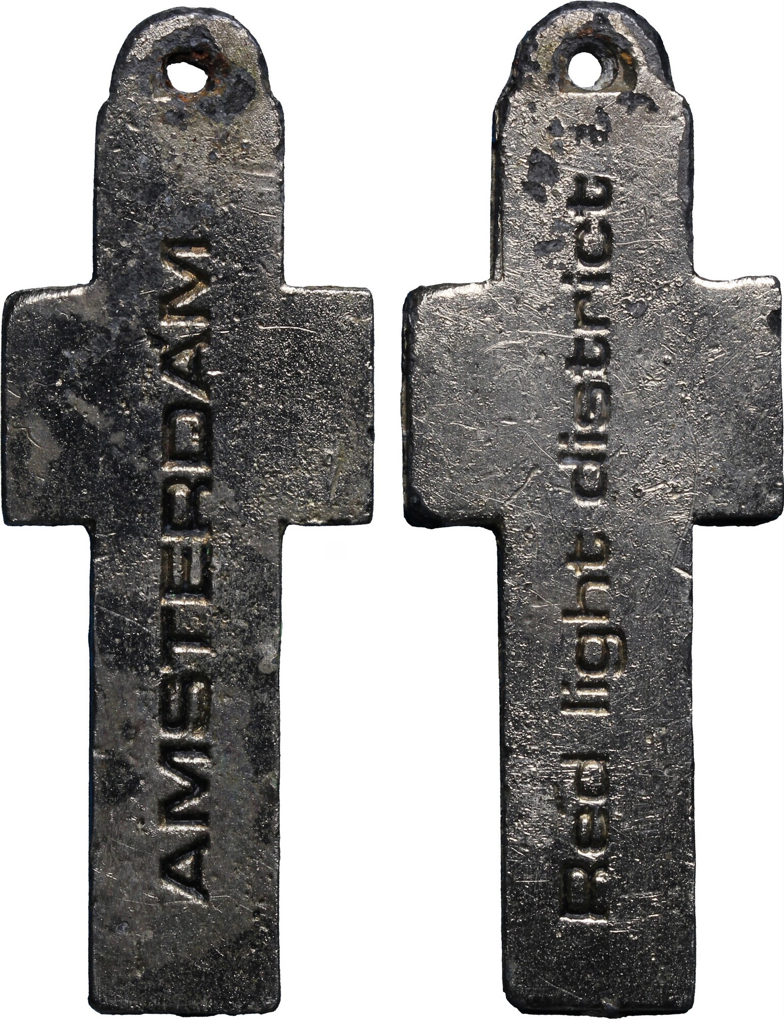 Sleutelhanger; kruisvormige hanger bestaande uit twee delen; deel 1: vz: vrouwenkopje met daaronder CASA; kz: AMSTERDAM, gewicht: 16.61 gram; deel 2: vz: mannenkopje met daaronder ROSSO, kz: RED LIGHT DISTRICT, gewicht 16.07 gram