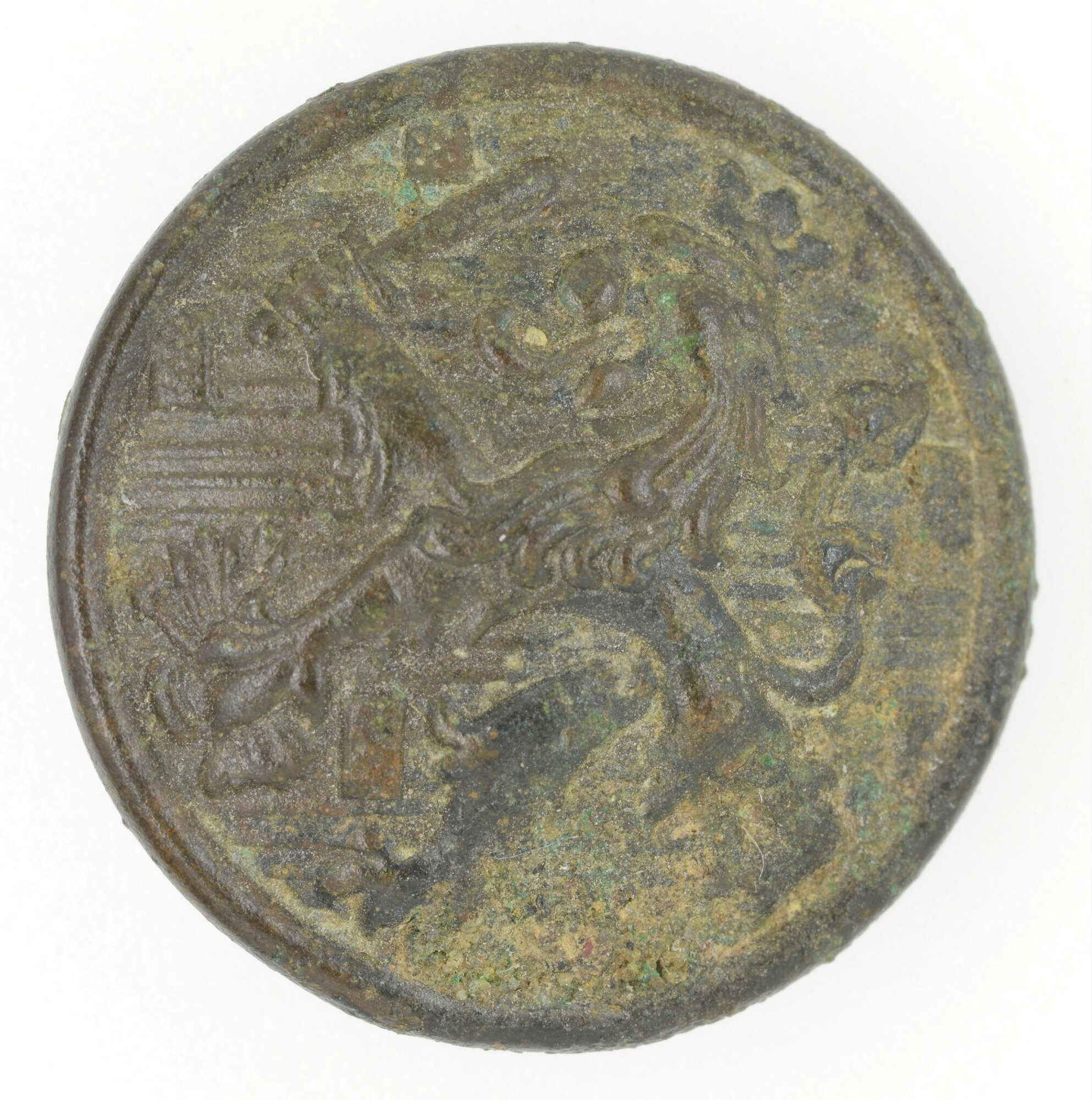 Knoop; draadoog(?) afgebroken; overjas; vz: leeuw motief; kz: leeg; gewicht: 3.33 gram