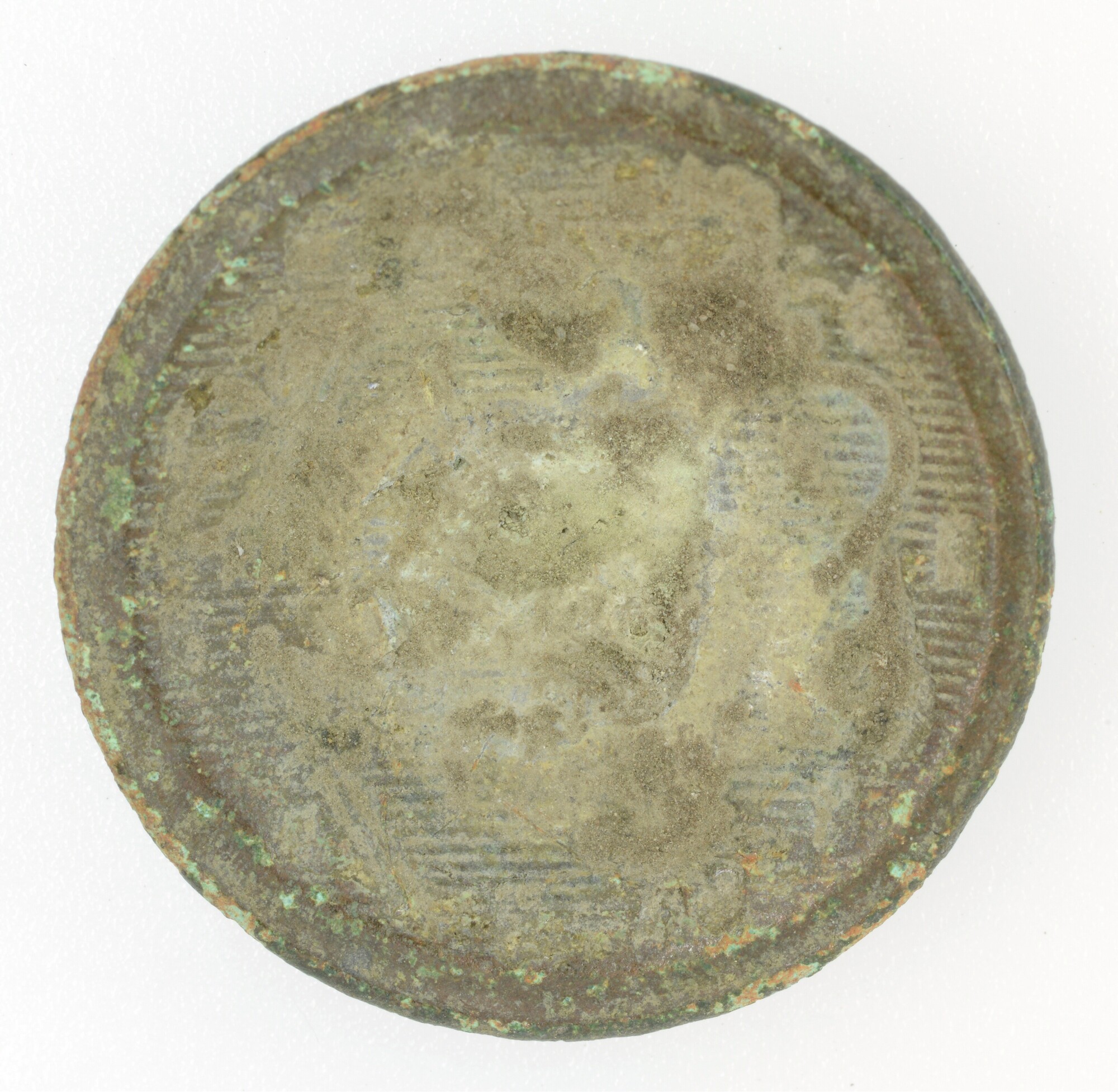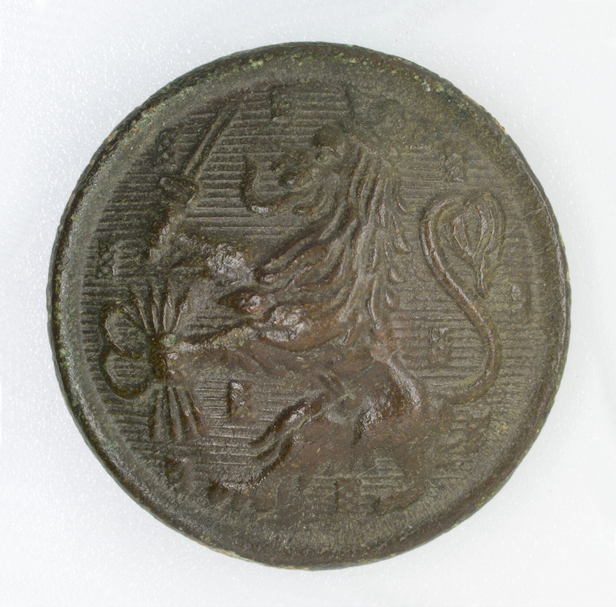 Knoop; draadoog?; oog afgebroken; overjas; enkelvoudige knoop, het (hier ontbrekende) oog is rechtstreeks op de holle voorzijde gesoldeerd. Door de holte is de afbeelding in spiegelbeeld deels in de binnenzijde zichtbaar (zie bijv. 5299-0119); gewicht: 3.22 gram