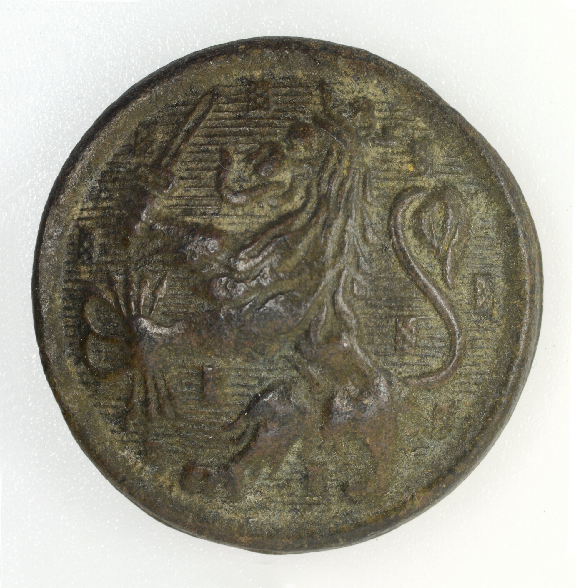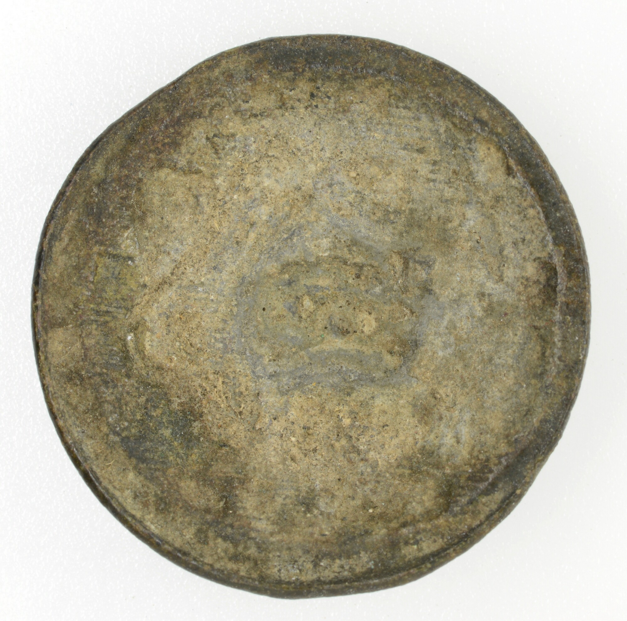 Knoop; draadoog?; oog afgebroken; overjas; enkelvoudige knoop, het (hier ontbrekende) oog is rechtstreeks op de holle voorzijde gesoldeerd. Door de holte is de afbeelding in spiegelbeeld deels in de binnenzijde zichtbaar (zie bijvoorbeeld 5299-0119); gewicht: 3.04 gram