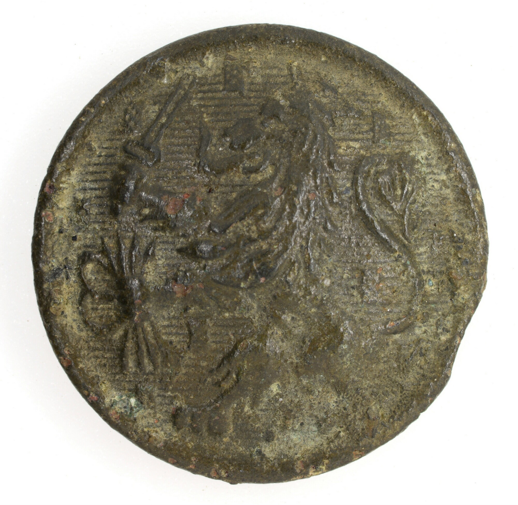Knoop; draadoog?; oog afgebroken; overjas; enkelvoudige knoop, het (hier ontbrekende) oog is rechtstreeks op de holle voorzijde gesoldeerd. Door de holte is de afbeelding in spiegelbeeld deels in de binnenzijde zichtbaar (zie bijvoorbeeld 5299-0119). De leeuw kenmerkt zich door het neerwaartse uiteinde van de staartpunt en de dubbele lus links van de pijlenbundel; gewicht: 2.01 ...