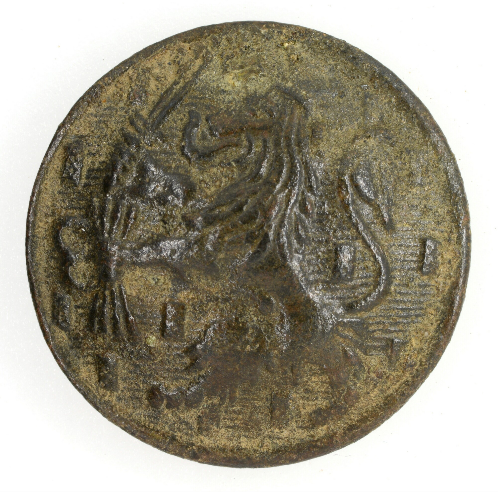Knoop; draadoog?; oog afgebroken; overjas; enkelvoudige knoop, het (hier ontbrekende) oog is rechtstreeks op de holle voorzijde gesoldeerd. Door de holte is de afbeelding in spiegelbeeld deels in de binnenzijde zichtbaar (zie bijvoorbeeld 5299-0119). De leeuw kenmerkt zich door het neerwaartse uiteinde van de staartpunt en de dubbele lus links van de pijlenbundel; gewicht: 3.18 ...