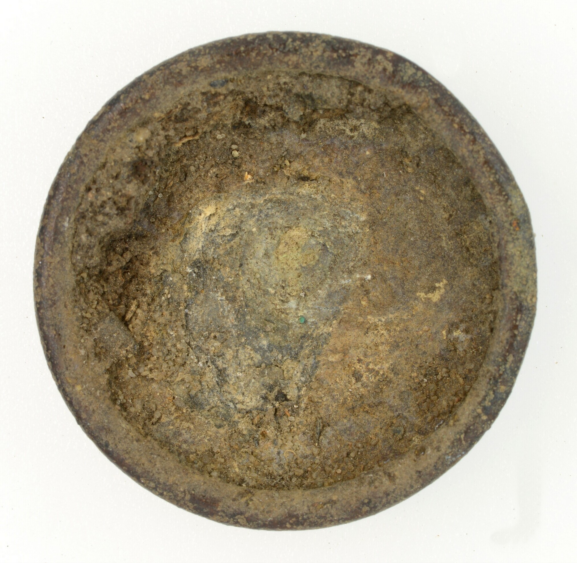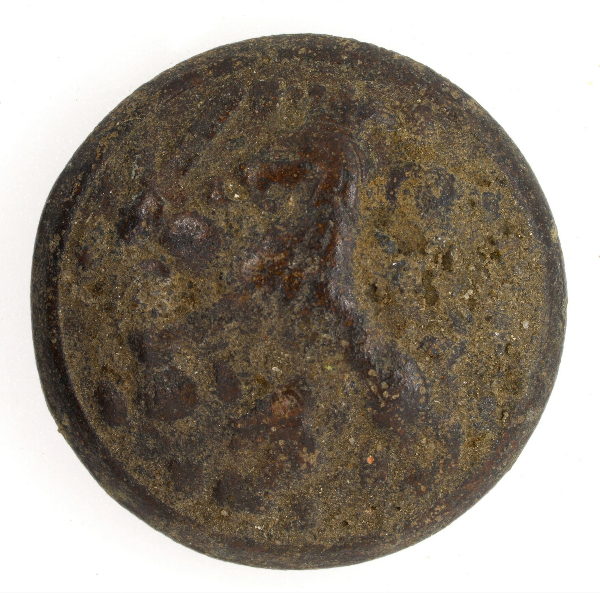 Knoop; draadoog?; oog afgebroken; overjas; enkelvoudige knoop, het (hier ontbrekende) oog is rechtstreeks op de holle voorzijde gesoldeerd. Door de holte is de afbeelding in spiegelbeeld deels in de binnenzijde zichtbaar (zie bijvoorbeeld 5299-0119). De leeuw kenmerkt zich door het neerwaartse uiteinde van de staartpunt en de dubbele lus links van de pijlenbundel; gewicht: 2.01 ...