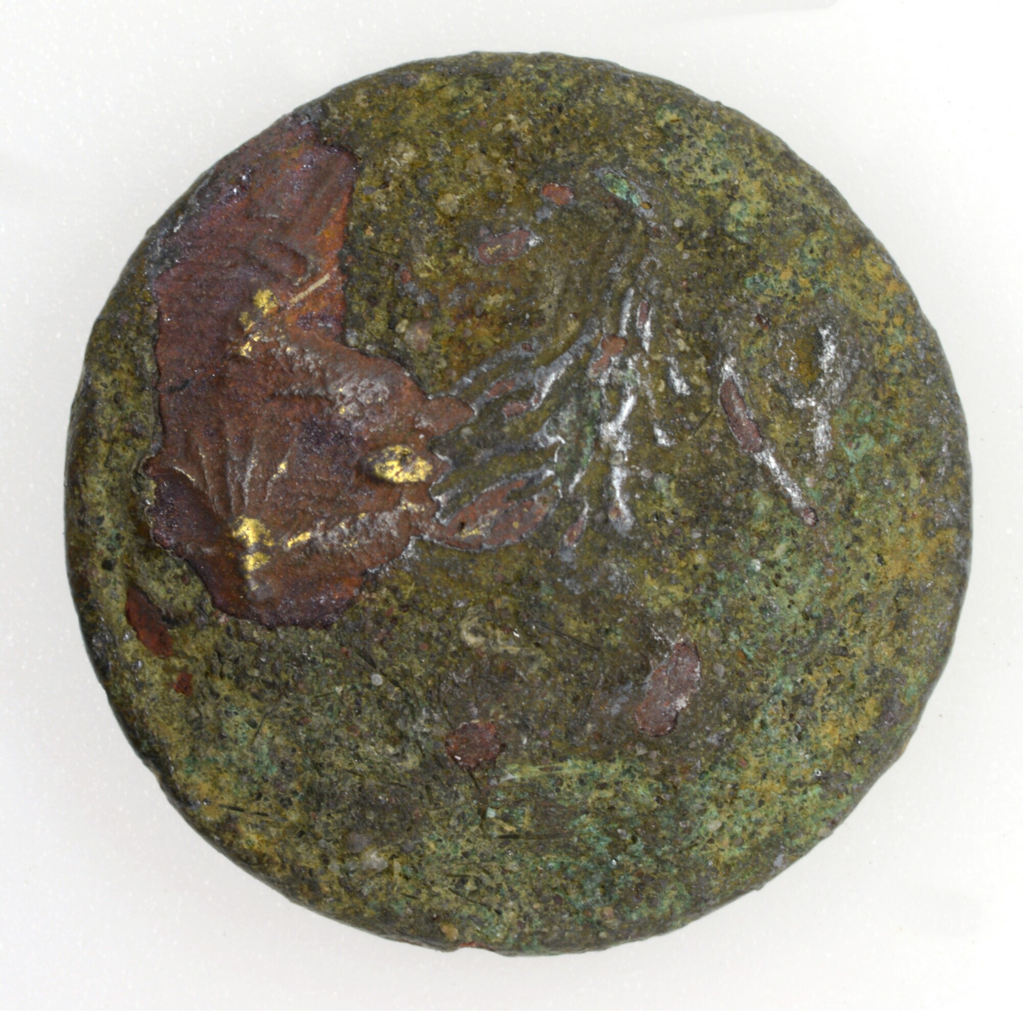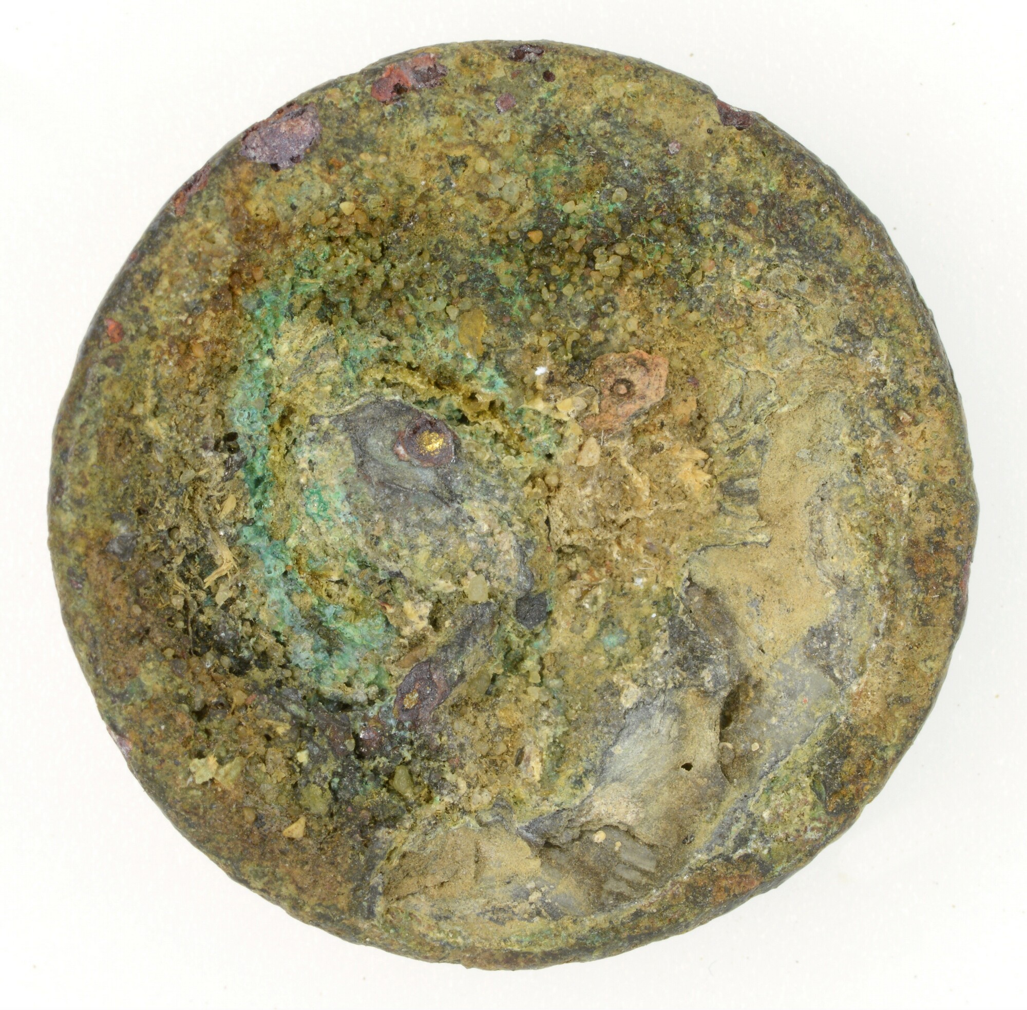 Knoop; draadoog?; oog afgebroken; overjas; enkelvoudige knoop, het (hier ontbrekende) oog is rechtstreeks op de holle voorzijde gesoldeerd. Door de holte is de afbeelding in spiegelbeeld deels in de binnenzijde zichtbaar (zie bijvoorbeeld 5299-0119). De leeuw kenmerkt zich door het neerwaartse uiteinde van de staartpunt en de dubbele lus links van de pijlenbundel; gewicht: 3.42 ...