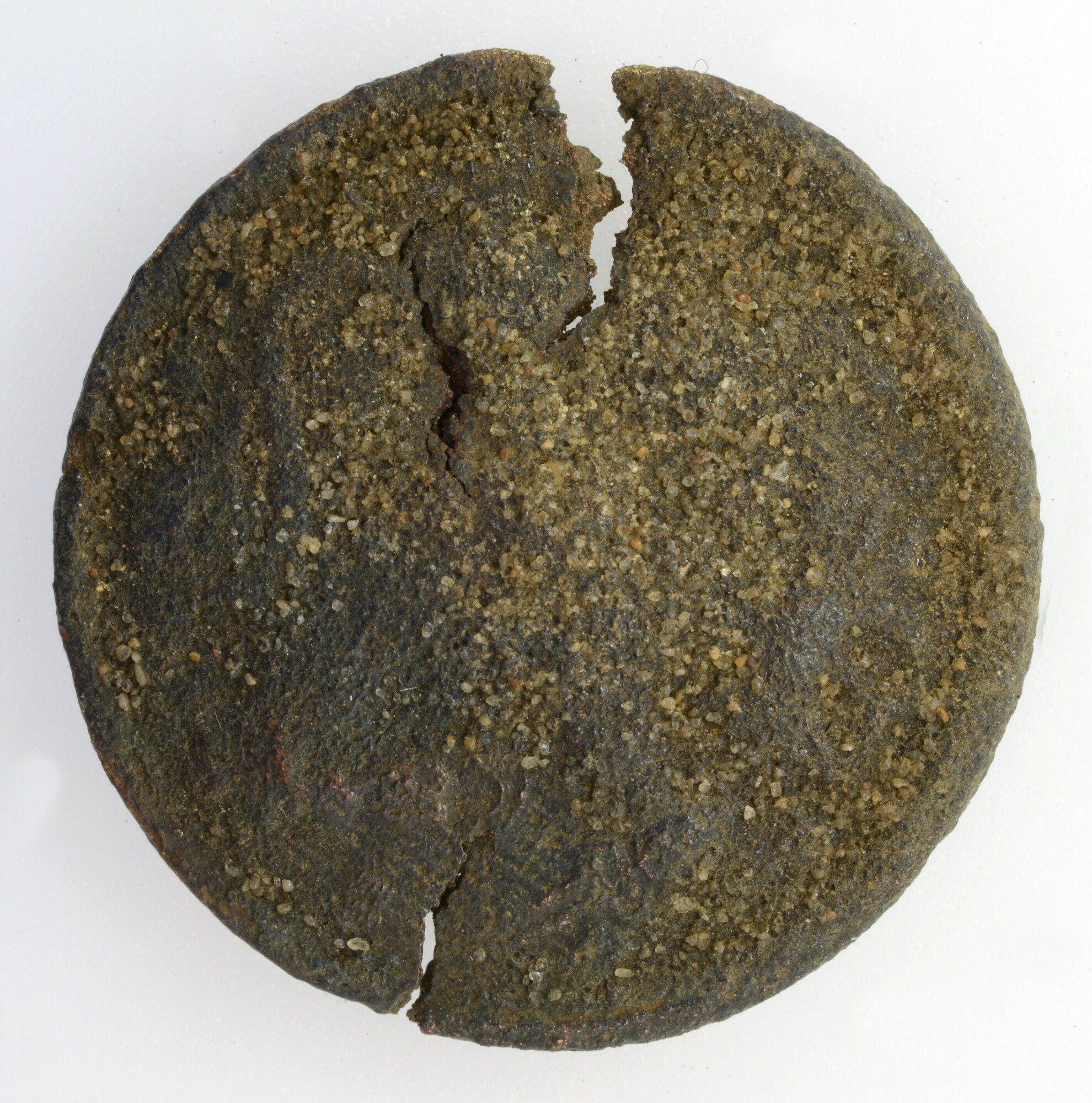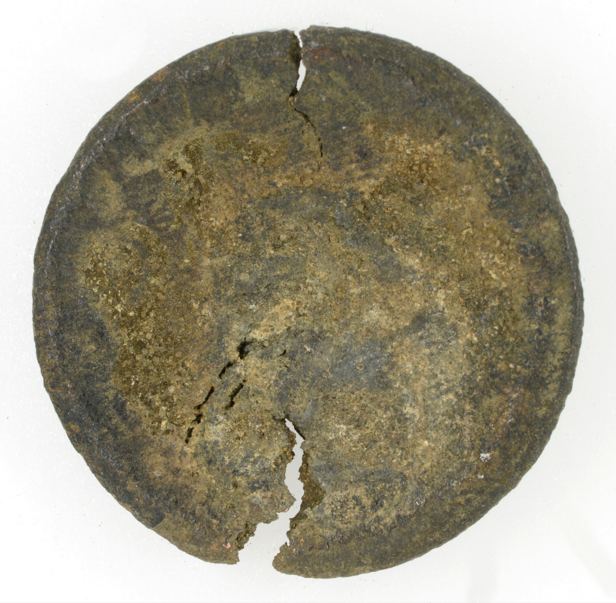 Knoop; draadoog?; oog afgebroken; overjas; enkelvoudige knoop, het (hier ontbrekende) oog is rechtstreeks op de holle voorzijde gesoldeerd. Door de holte is de afbeelding in spiegelbeeld deels in de binnenzijde zichtbaar (zie bijvoorbeeld 5299-0119). De leeuw kenmerkt zich door het neerwaartse uiteinde van de staartpunt en de dubbele lus links van de pijlenbundel; gewicht: 2.87 ...