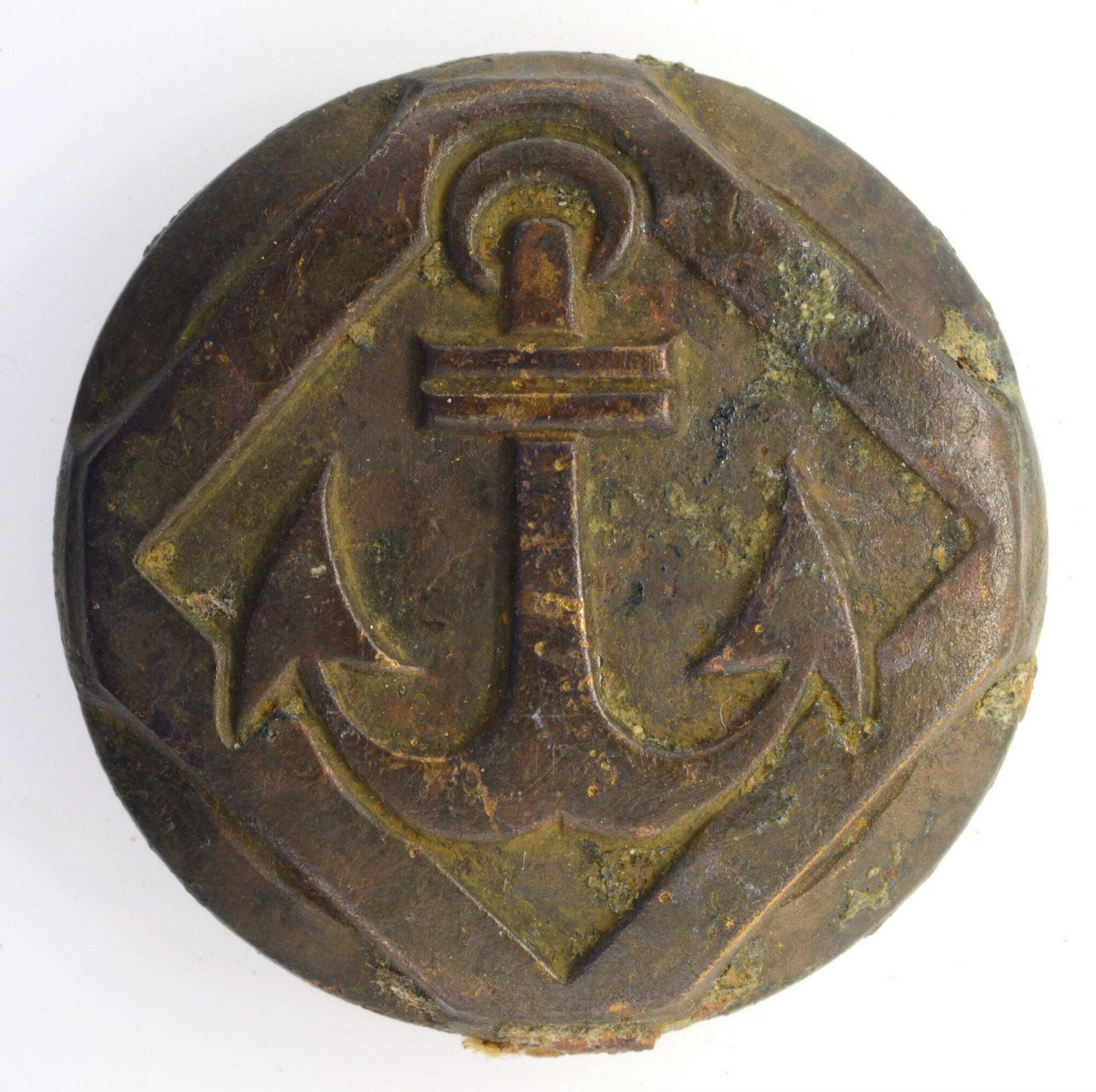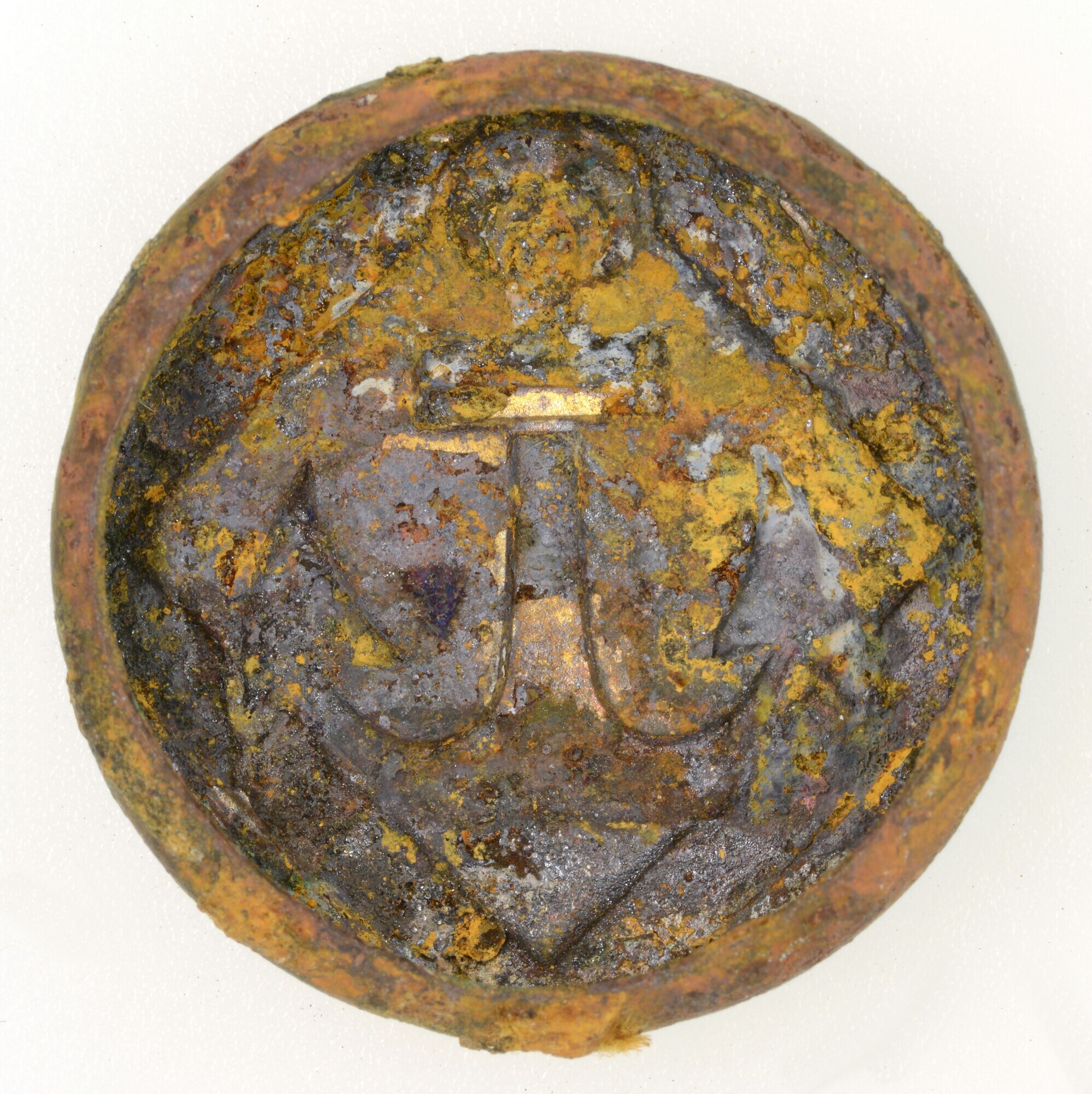Knoop; draadoog(?) afgebroken; marine?; vz: anker binnen een ruit met uitsparingen voor ankeroog en punten; kz: ontbreekt?; gewicht: 1.36 gram