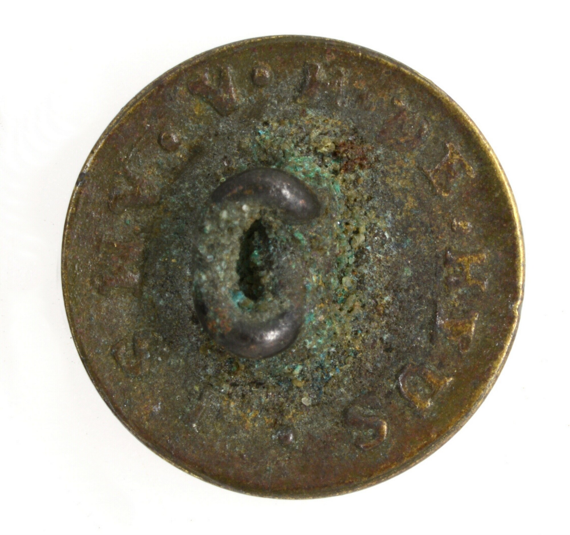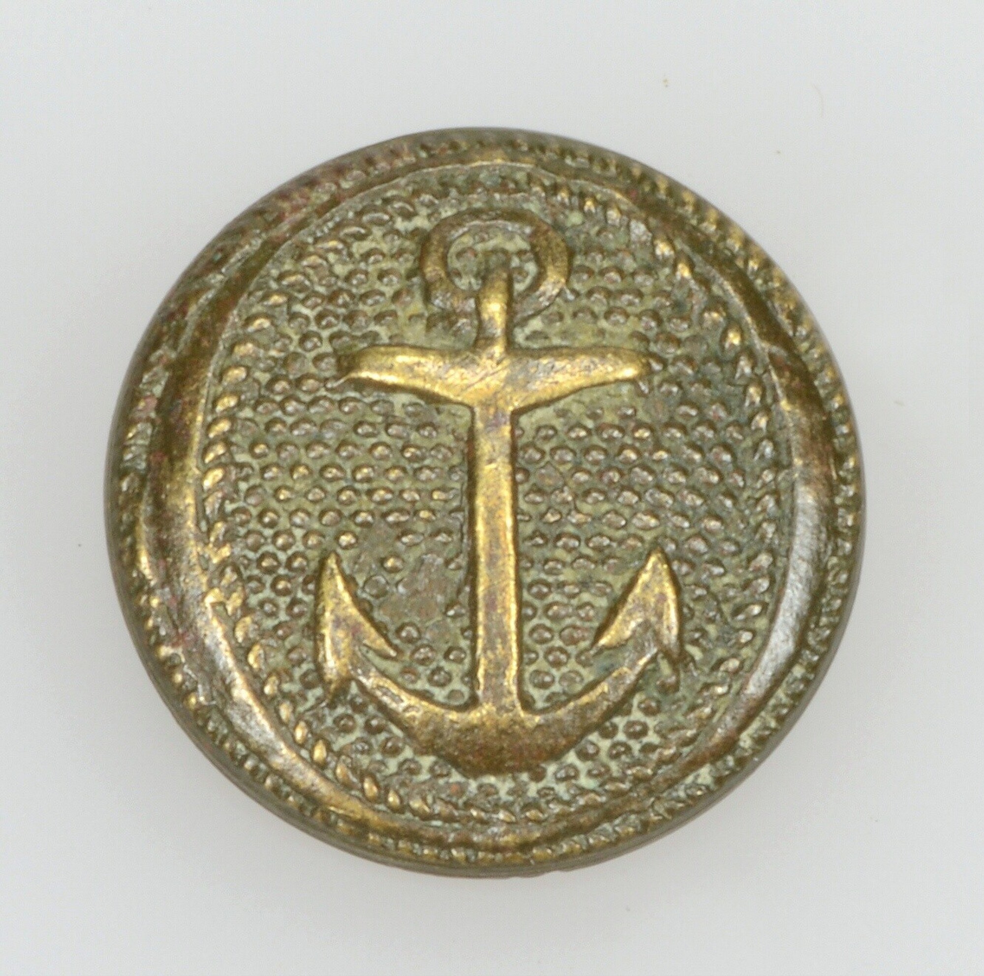 Knoop; draadoog; oog platgedrukt; marine; vz: anker op fijn gepuncteerde ondergrond binnen een kabel. Het beeldvlak is eliptisch van vorm, door een verdikte rand aan linker en rechter zijde; type lijkt op 5299-0124, maar heeft een grover gepuncteerd veld; kz: gemerkt: V.H. DE HEUS .AMS * ROTTERDAM; gewicht: 1.86 gram