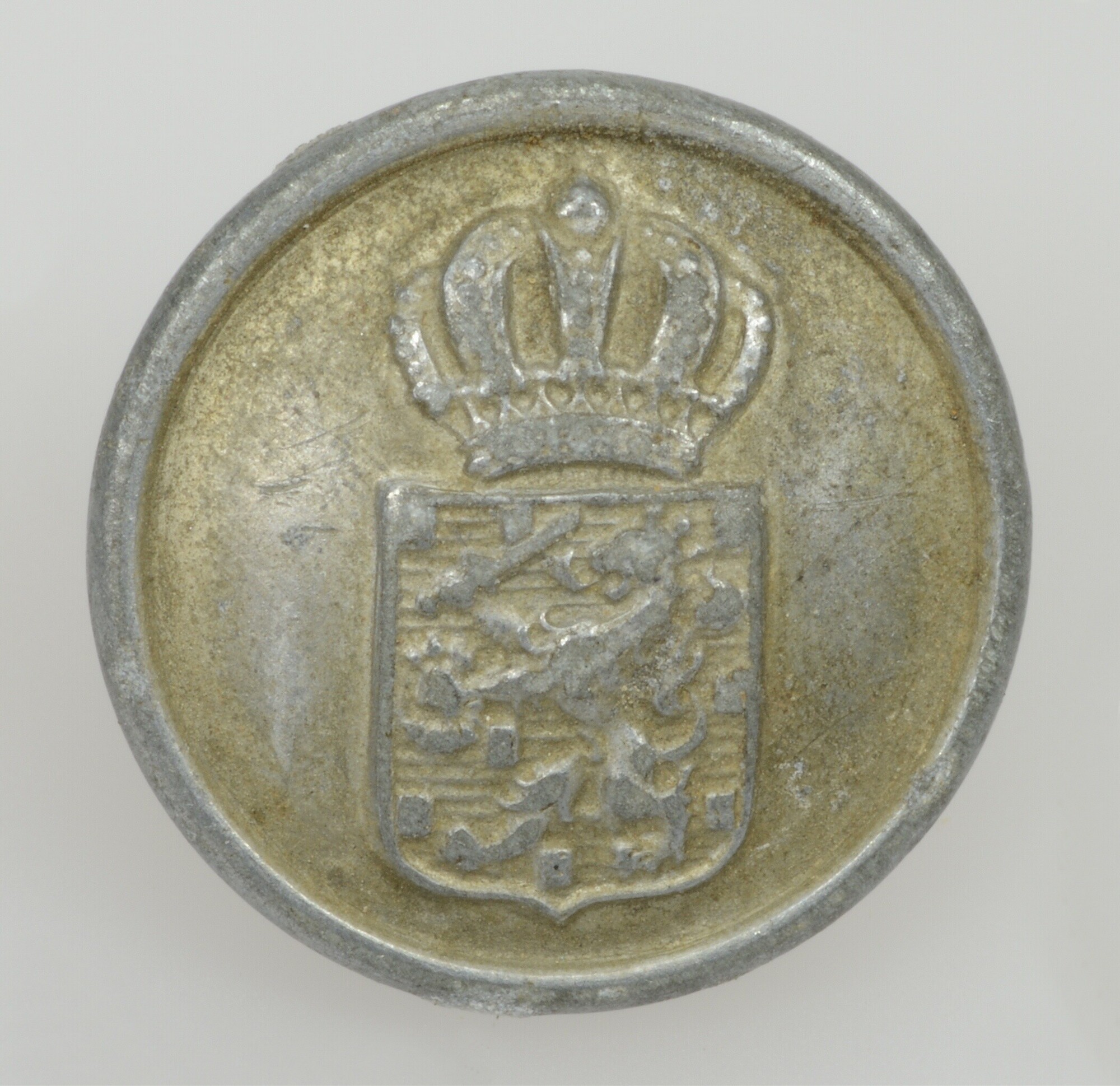 Knoop; draadoog; verguld aluminium of zinken knoop; vz: gekroond schild van het Rijkswapen; kz: leeg; betreft een kleinere maat dan 5299-0137 en 5299-0138; gewicht: 1.69 gram