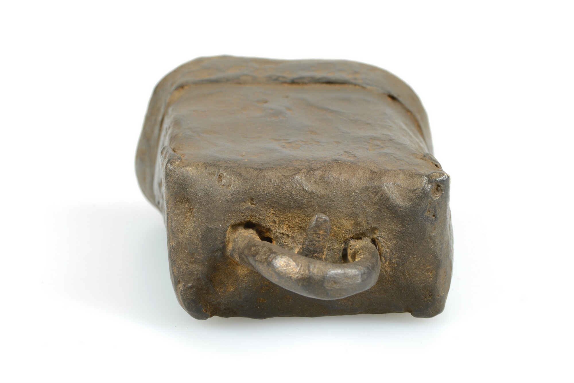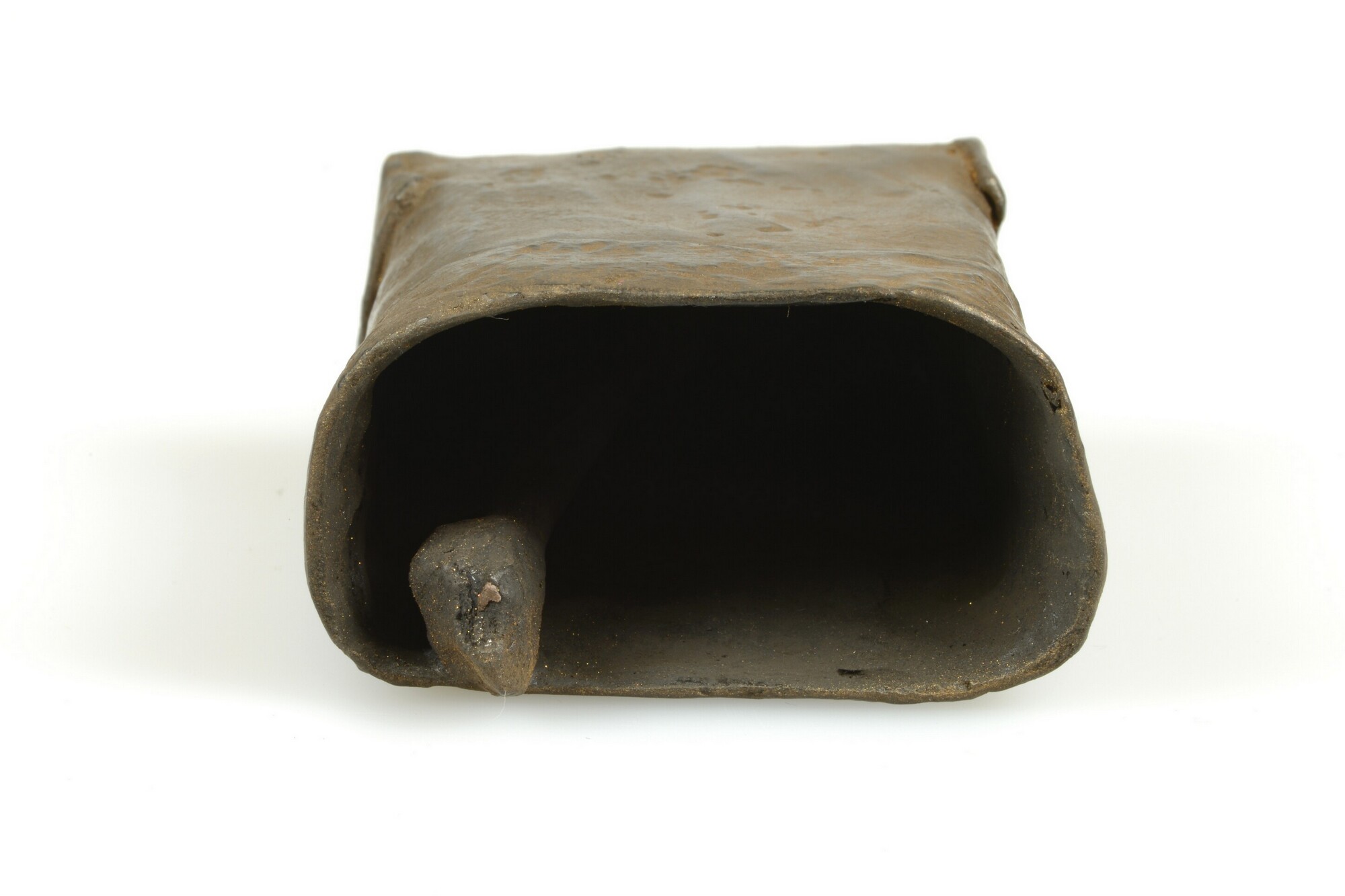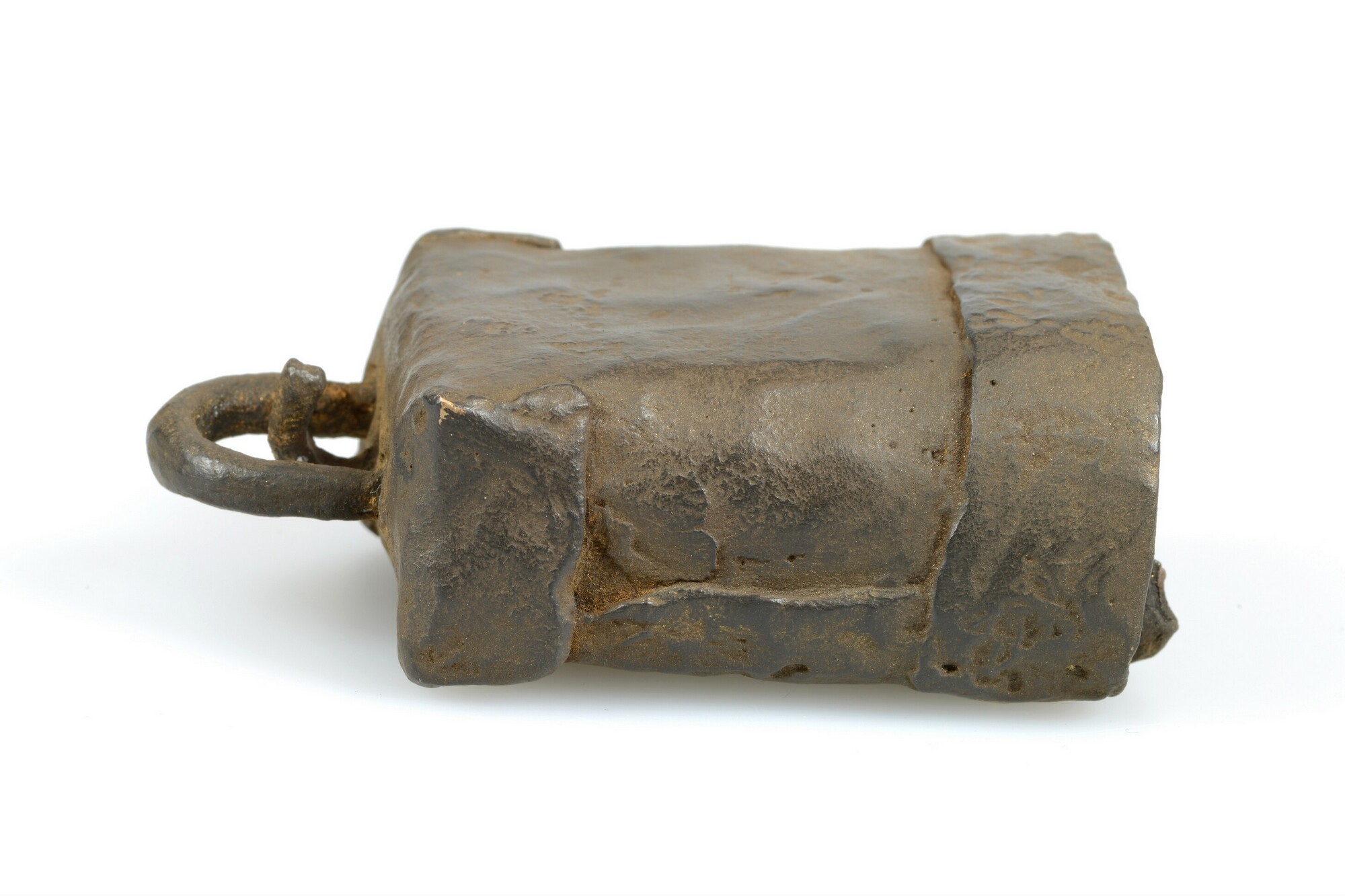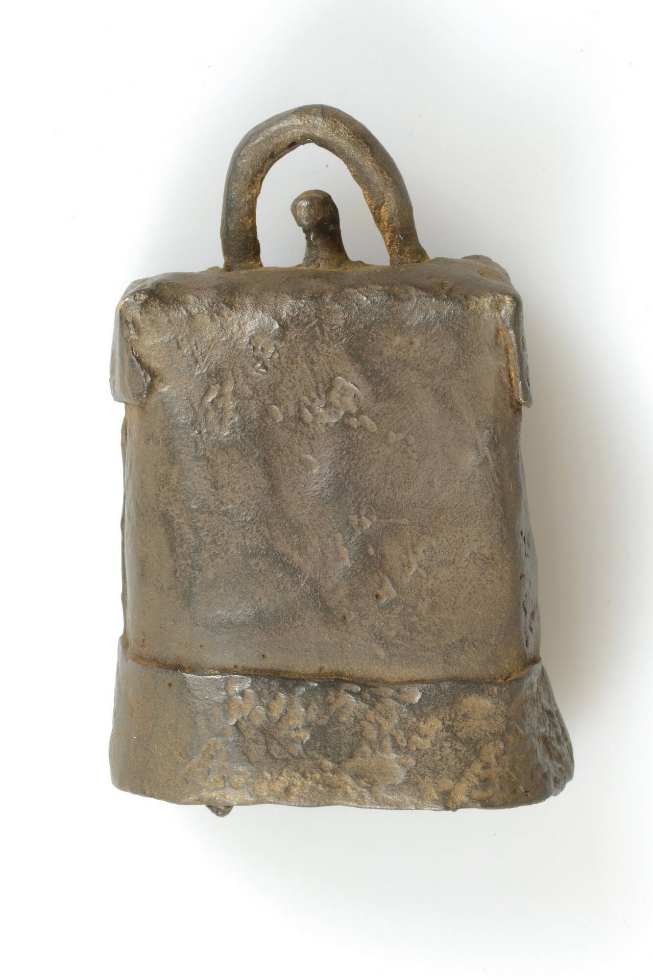 Bel; rechthoekig met verdikte rand aan de onderzijde; hangoog aan de bovenzijde; conische klepel