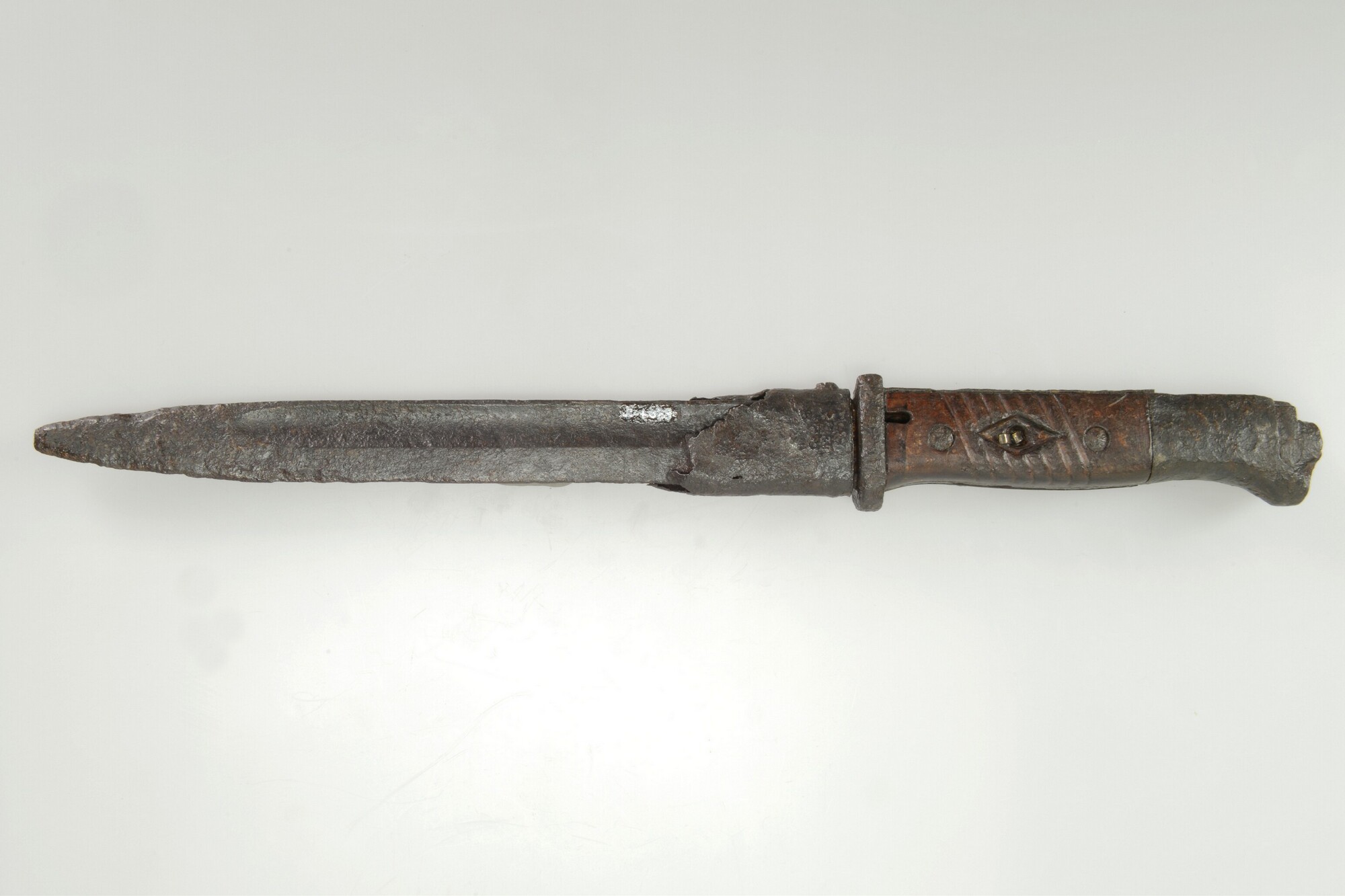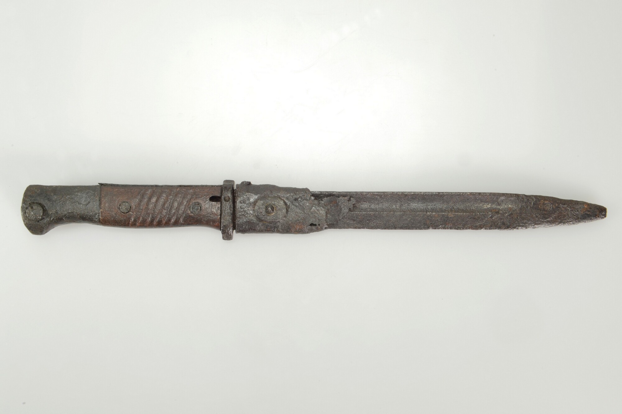 Bajonet; type M.1884/98 (type III) voor de Mauser 98k karabijn. Op de schede zijn stempelingen aangebracht: het wapennummer 9302 en het jaar van aanmaak 1939