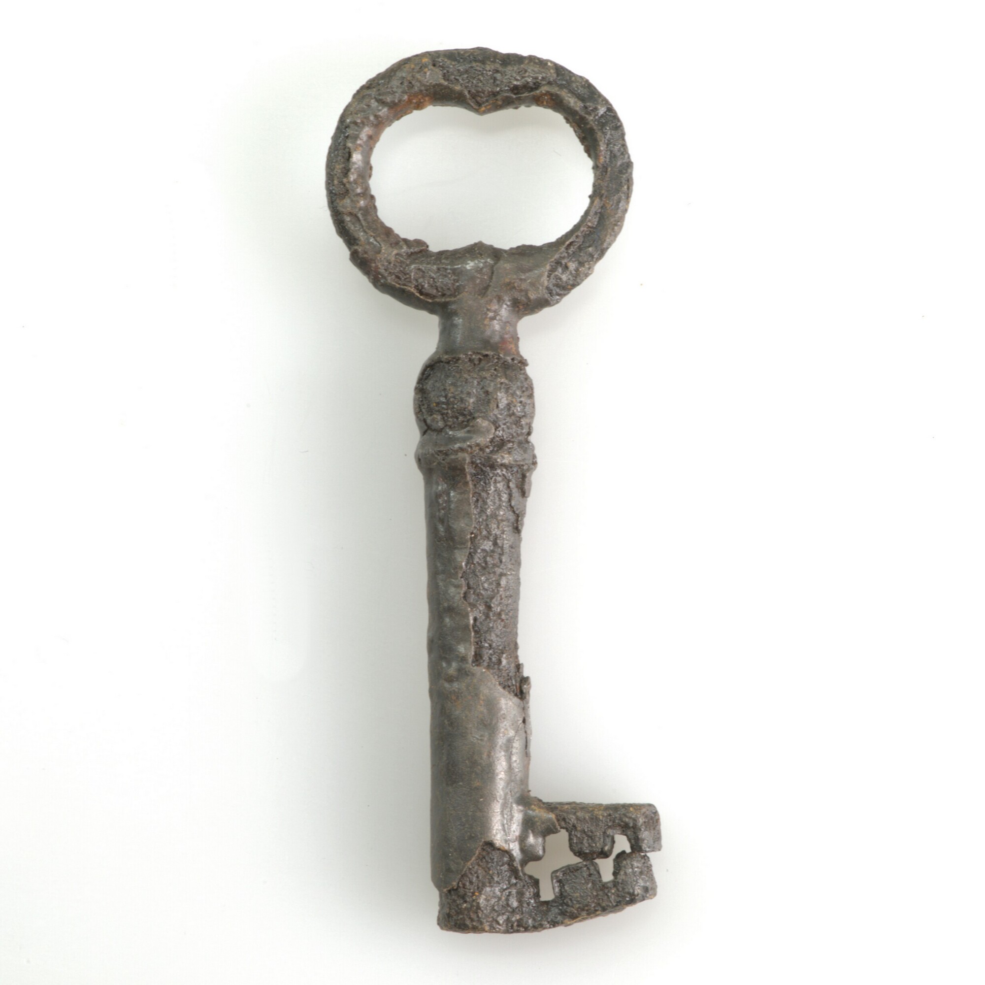 Sleutel; niervormige greep en holle steel met korte, (krom gedraaide) baard