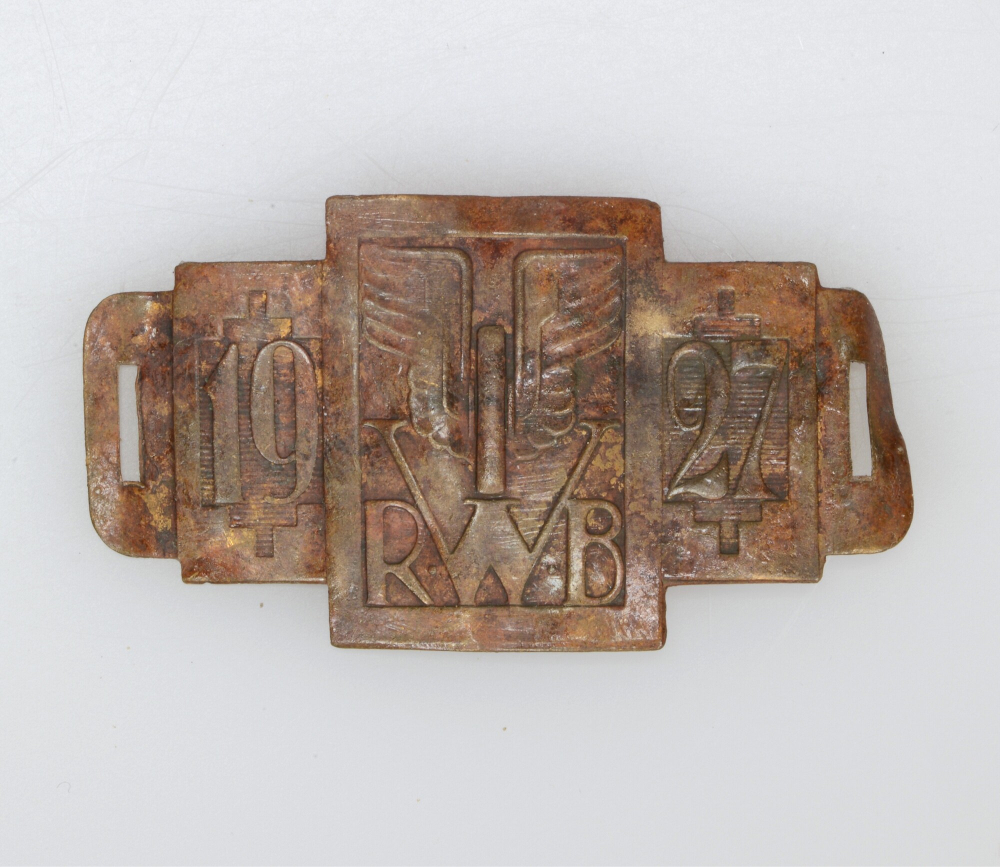 Rijwielbelastingplaatje; rechthoekig, kruisvormig; met aan beide uiteinden rechthoekige uitsparingen om het plaatje op te hangen aan de fiets; vz: 1927 met daartussen RWB en een gevleugelde I