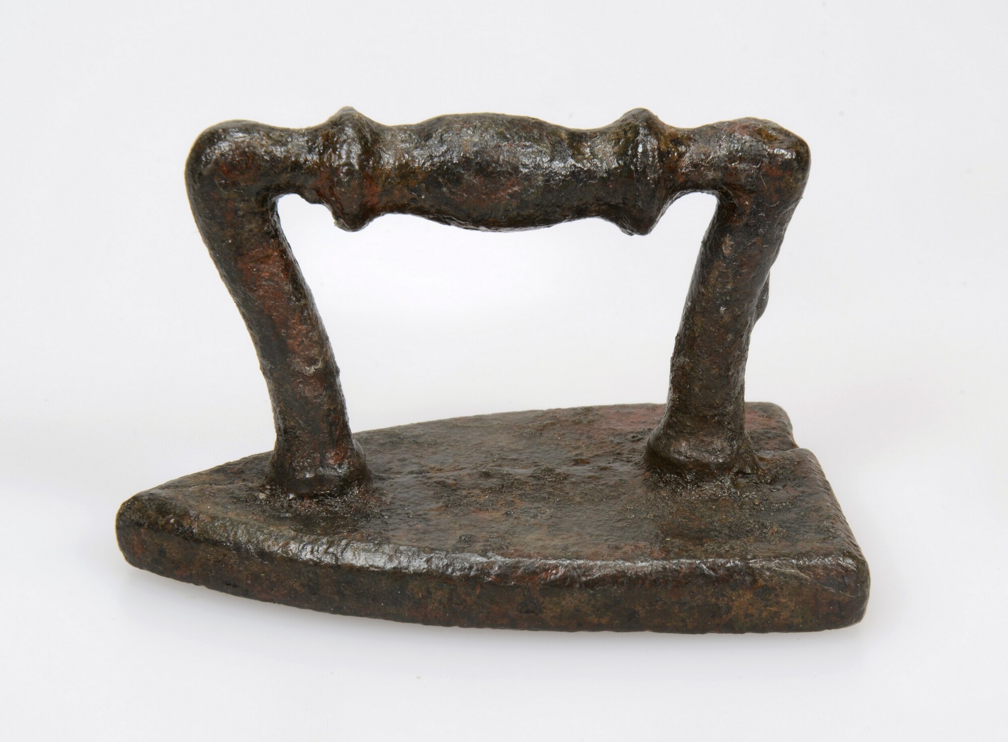 Strijkijzer; miniatuur / speelgoed; ijzeren imitatie balustervormig houten handvat