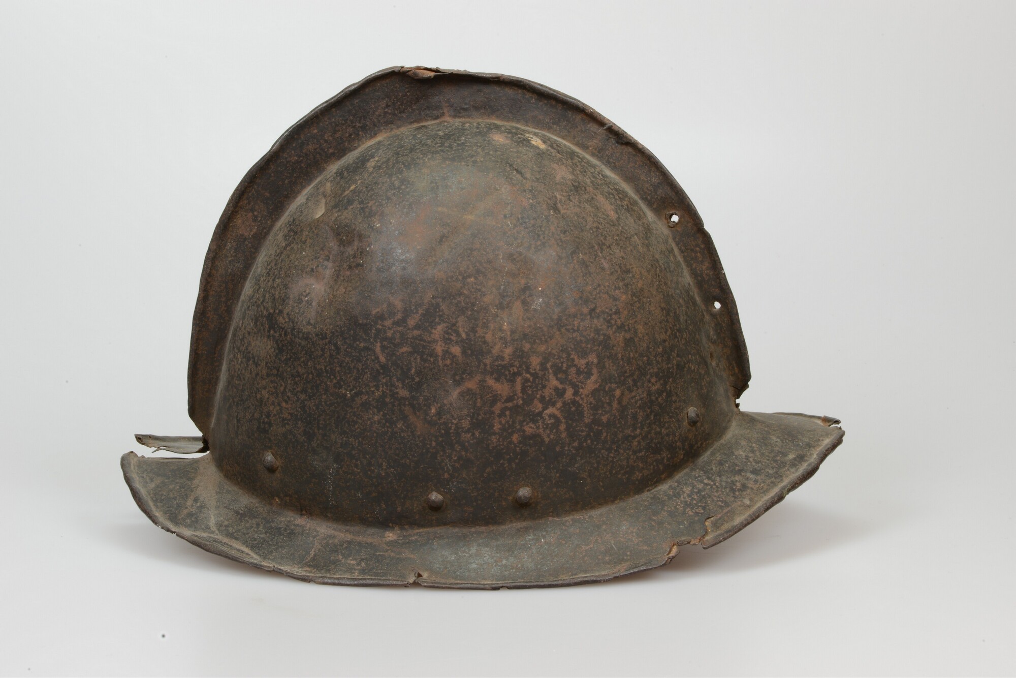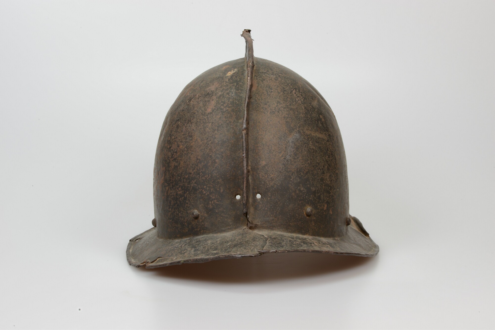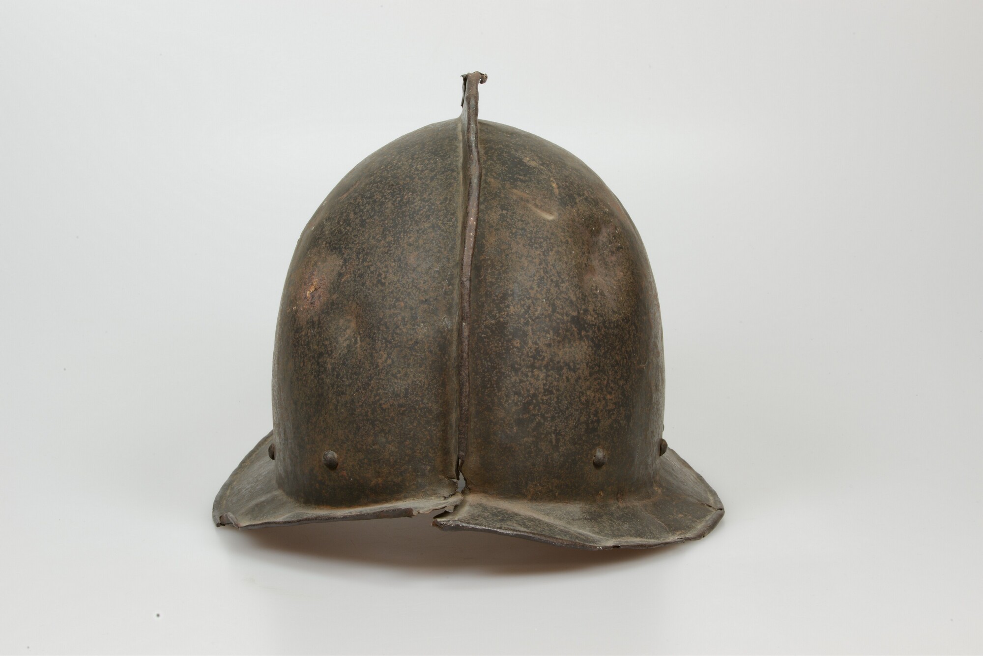 Helm; type Morionhelm met kam en omgeslagen opstaande rand; klinknagels langs onderzijde helmbol
