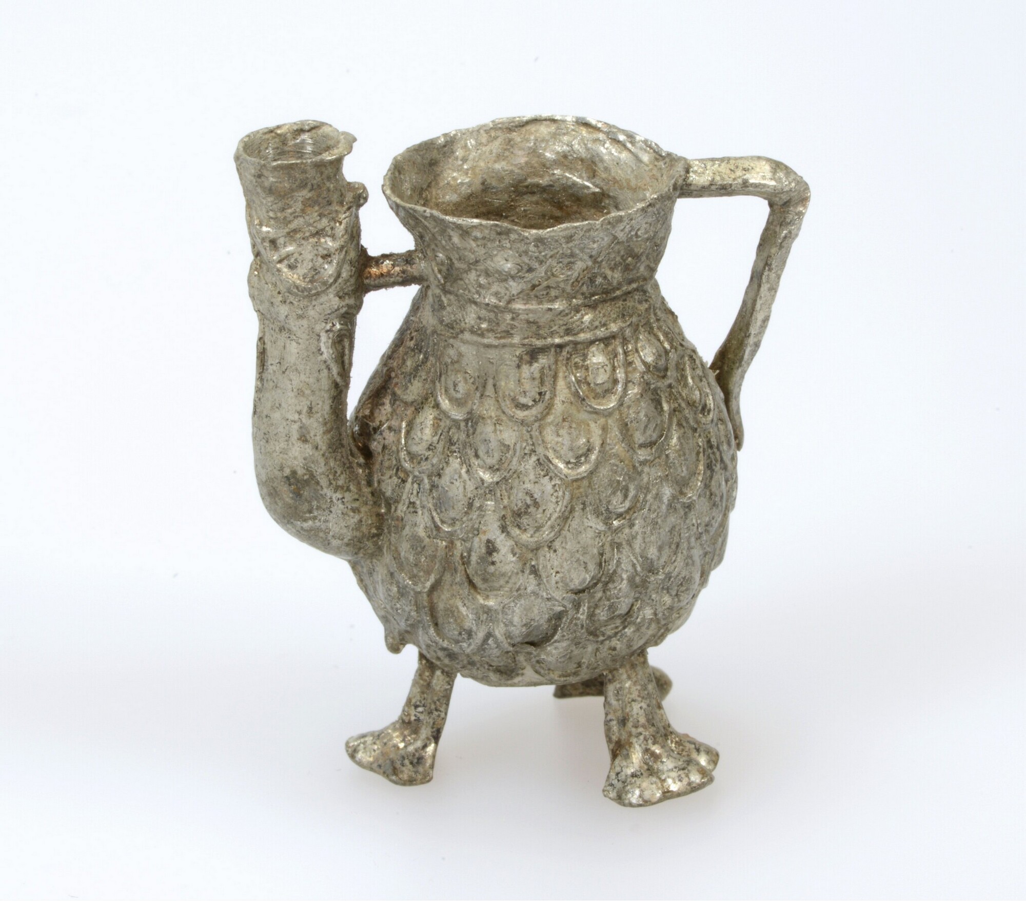 Tuitkan; speelgoed; miniatuur tuitkan; versierd met een patroon van schubben op de buik en een Franse lelie op de bodem. De kan staat op drie hoge poten en is voorzien van een haakoor en een hoge tuit