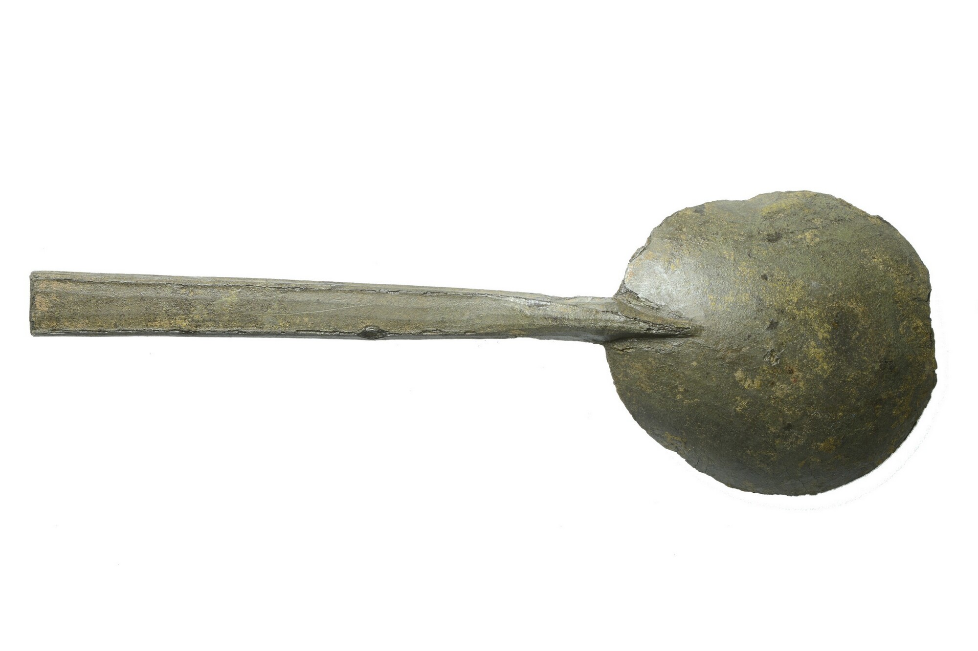 Lepel; sn-lep; platte steel en naald eindigend in een ronde bak; merkteken in bak
