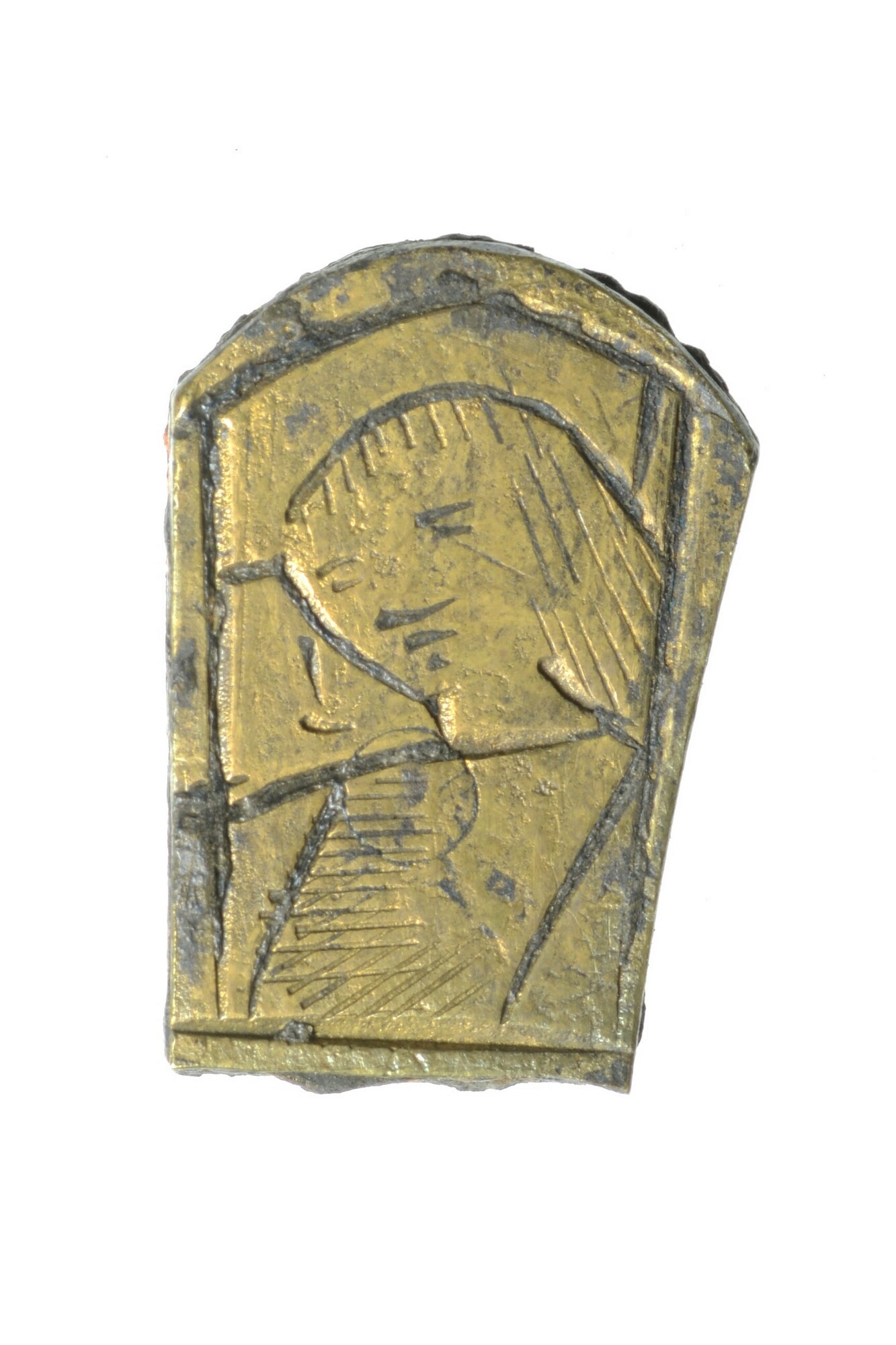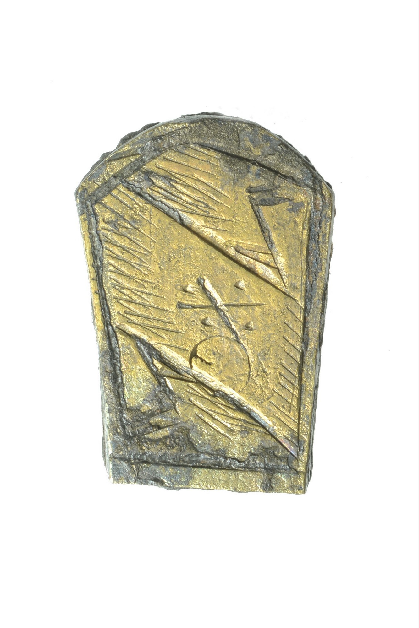 Mesheftbekroning; op één zijde staat een mensfiguur en op de andere zijde een geometrische versiering