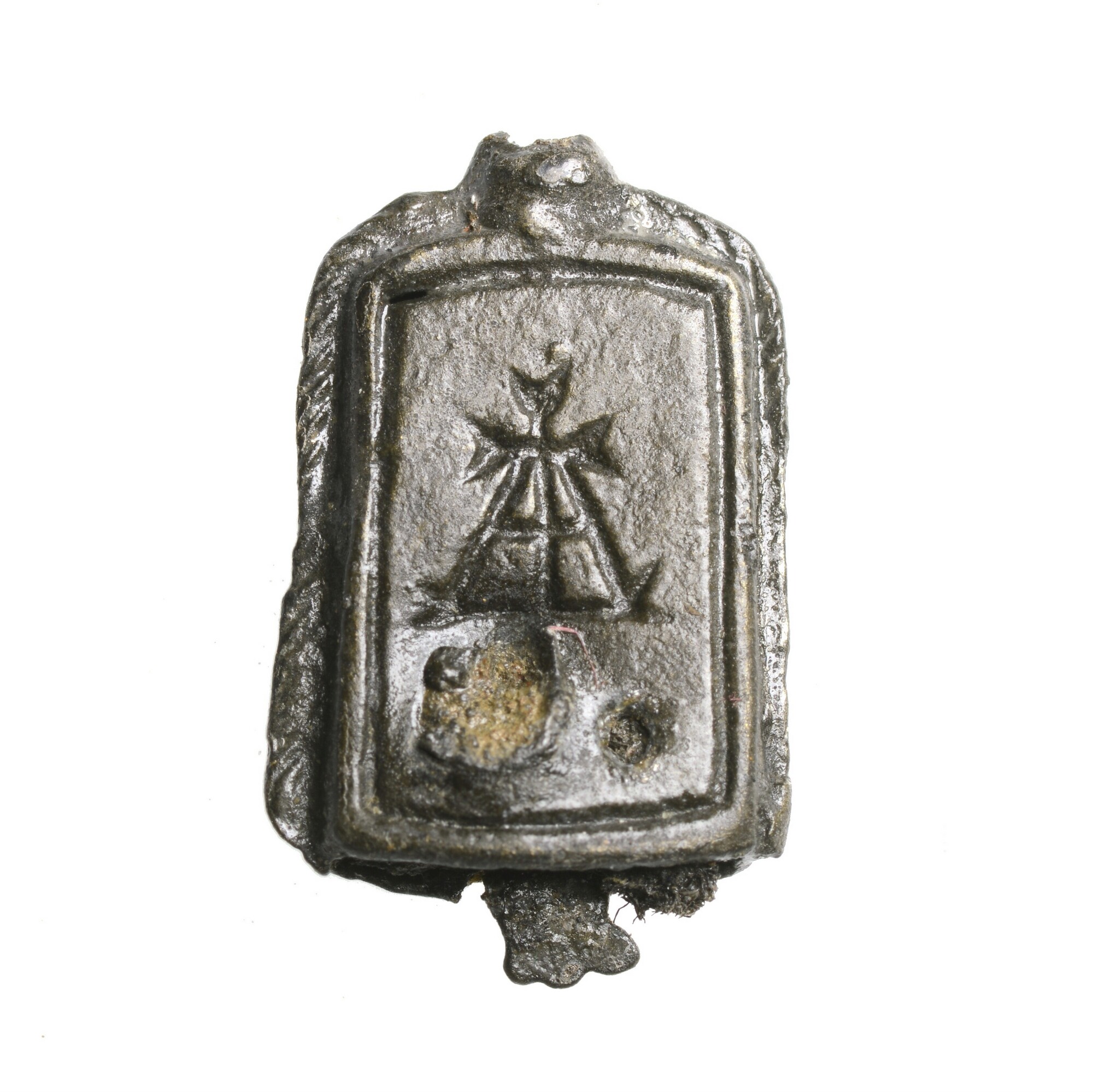 Riemtong; rechthoekig met ijzeren nagel; huismerk op één zijde en op de andere zijde is binnen een omlijsting een onduidelijke afbeelding zichtbaar