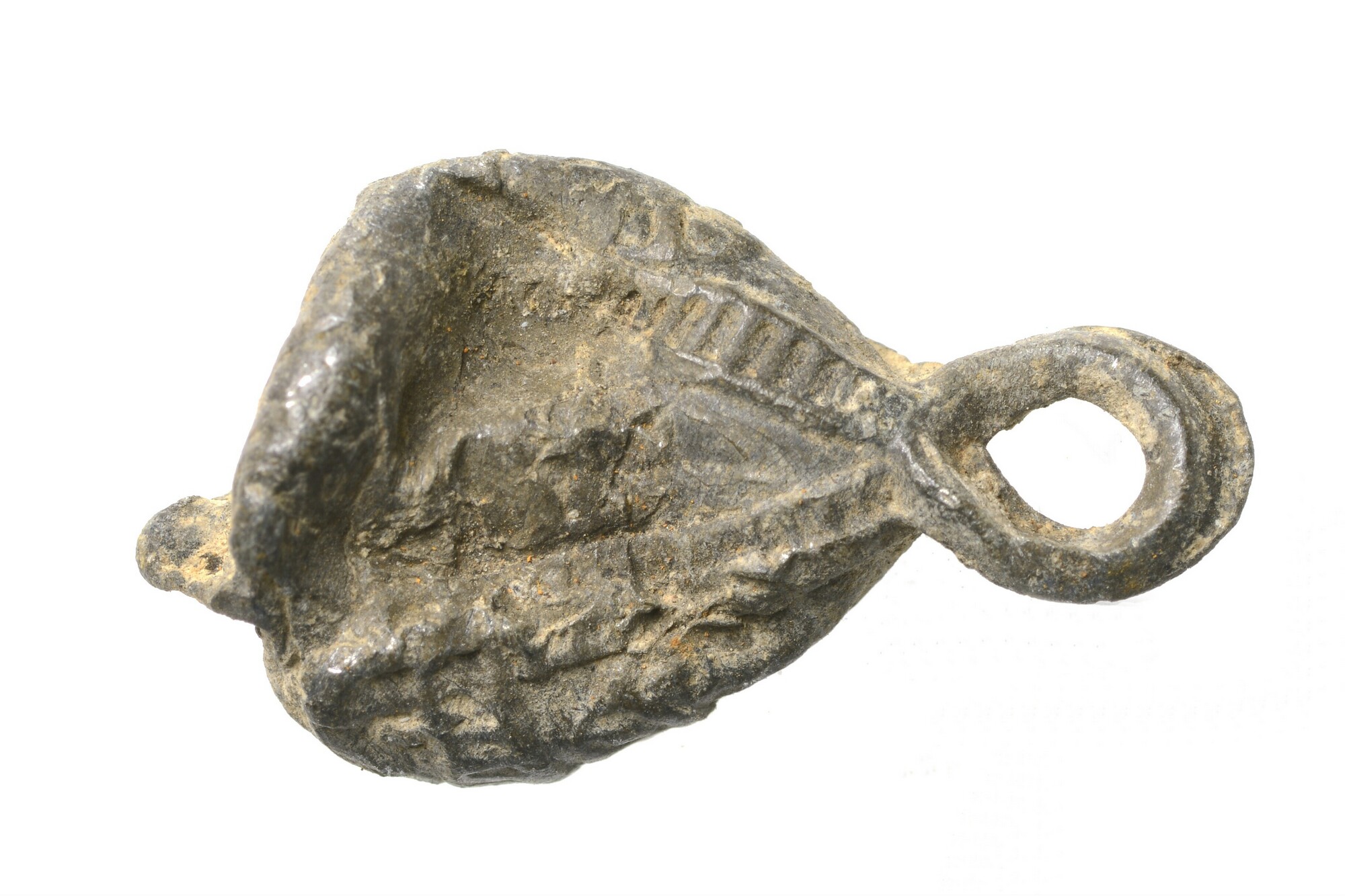 Bedel; klein hol, bolvormig object met een puntje aan de onderzijde en ophangoog. De bovenste helft is verdeeld in kwadranten met ronde radvormige versieringen. De onderste helft is eveneens verdeeld in kwadranten