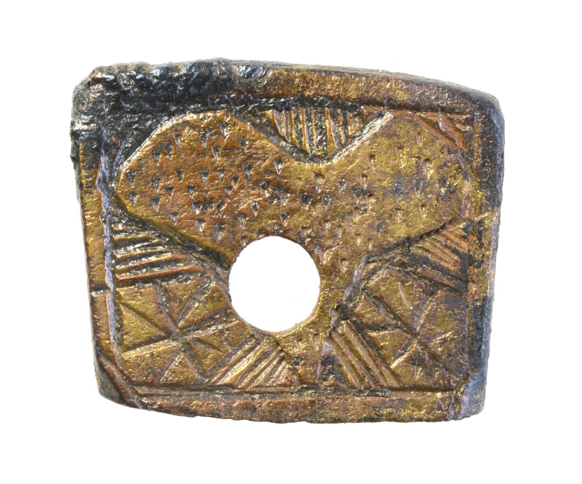 Mesheftbekroning; plaatje van een heft met ingegraveerde versieringen, vermoedelijk een stilistisch gevormd hart