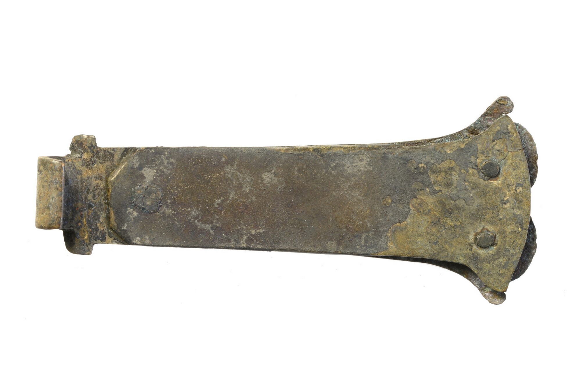 Boekbandsluiting; de sluithaak is voorzien van een klinkplaatje dat aan de achterzijde is vastgeklonken. versierd met een zaagsnede