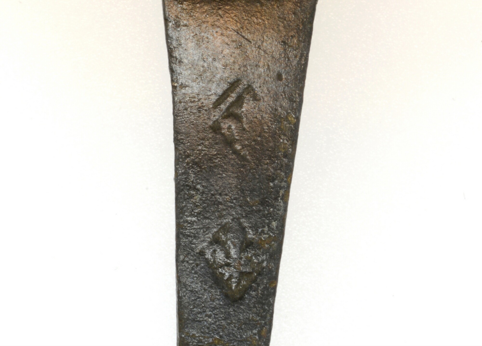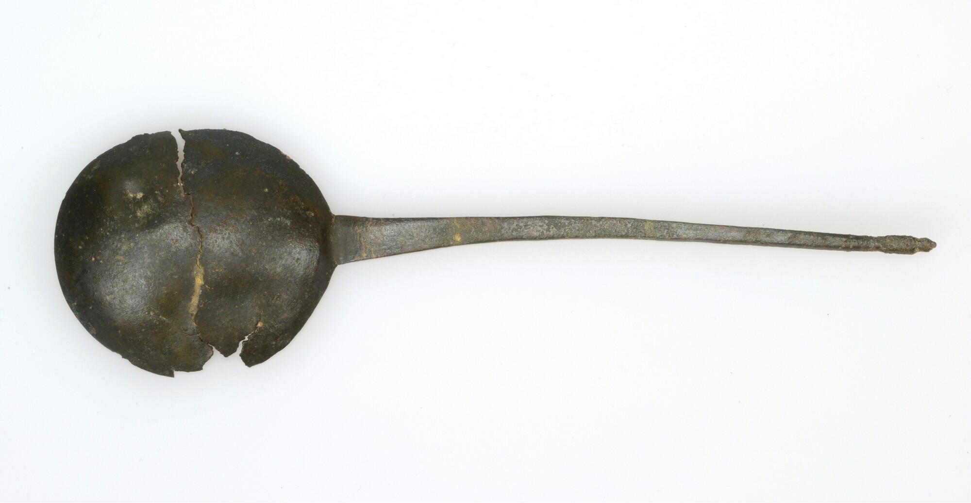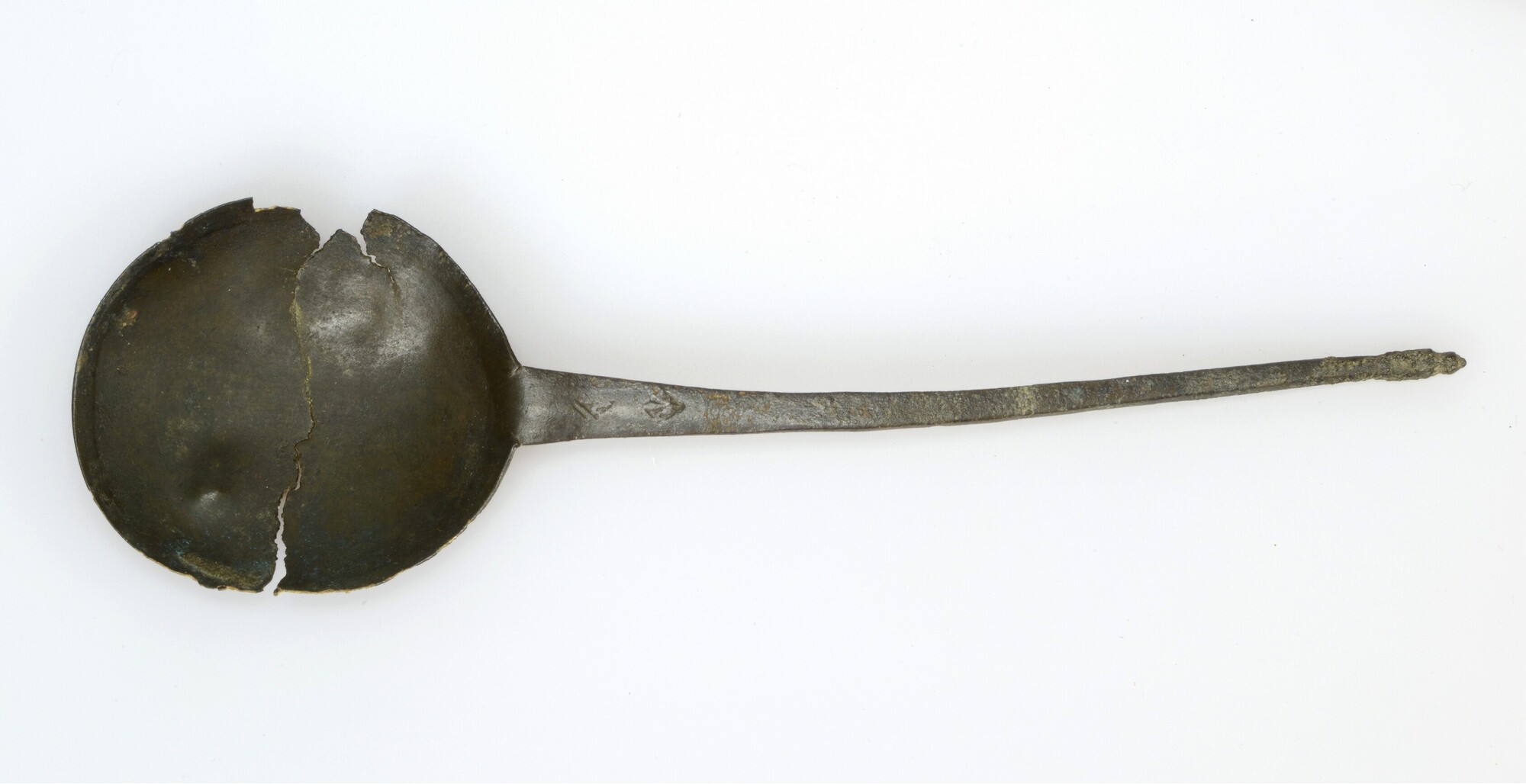 Lepel; uit één stuk geknipt en geslagen; vijgvormige bak; platte steel met knopje op het steeluiteinde; merkteken op steel: 2x Franse lelie