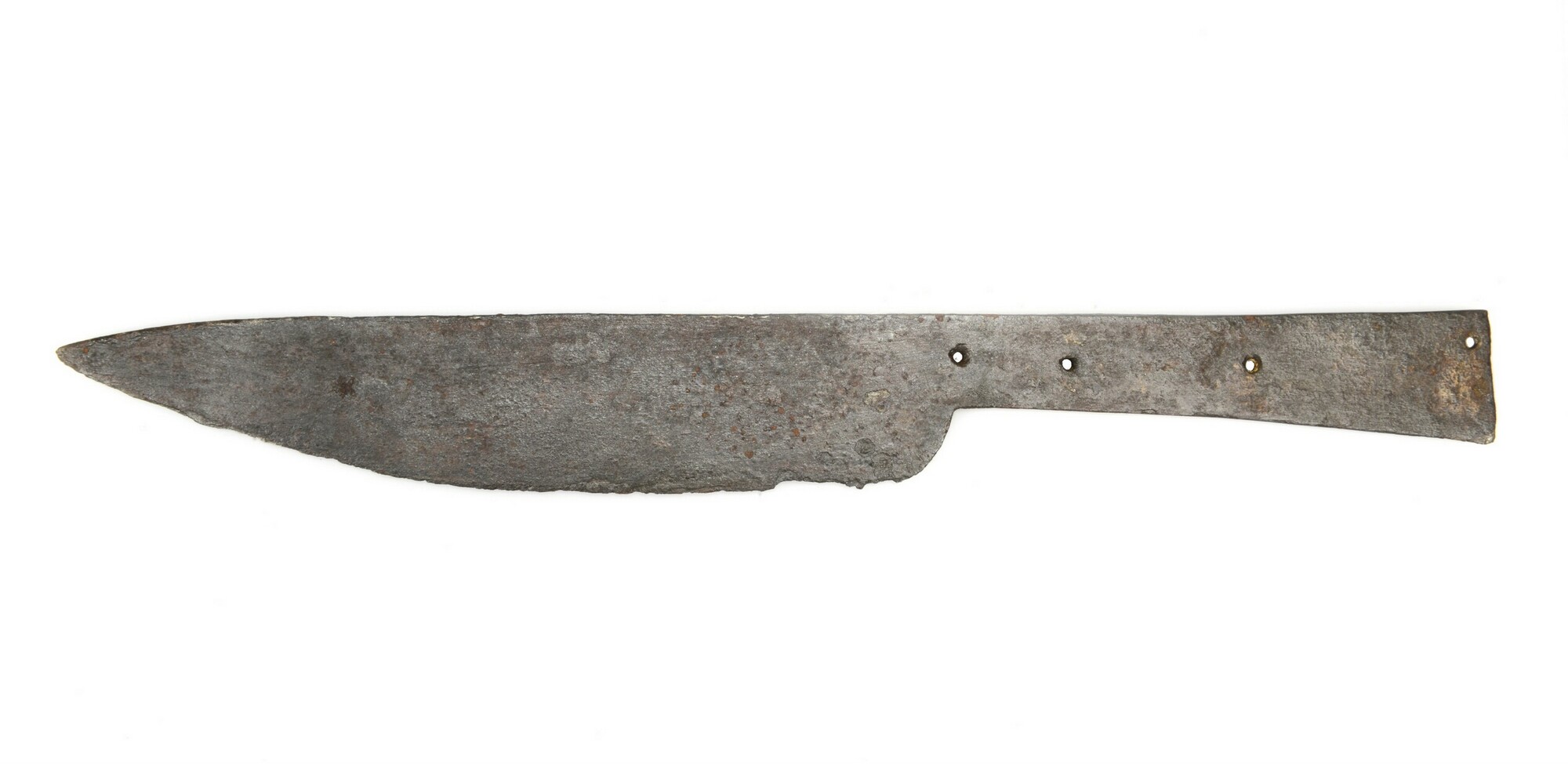 Mes; ijzer; uit een stuk gesmeed; 4 bevestigingsgaatjes in handvat; merkteken op lemmet: ster