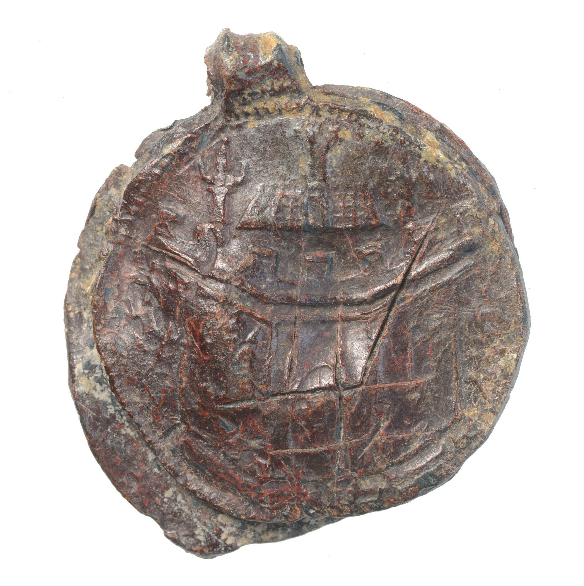 Textiellood; pb-tex; vz.: kasteel met kantelen; kz.: letters HAGA met ooievaar erboven; herkomst: Den Haag