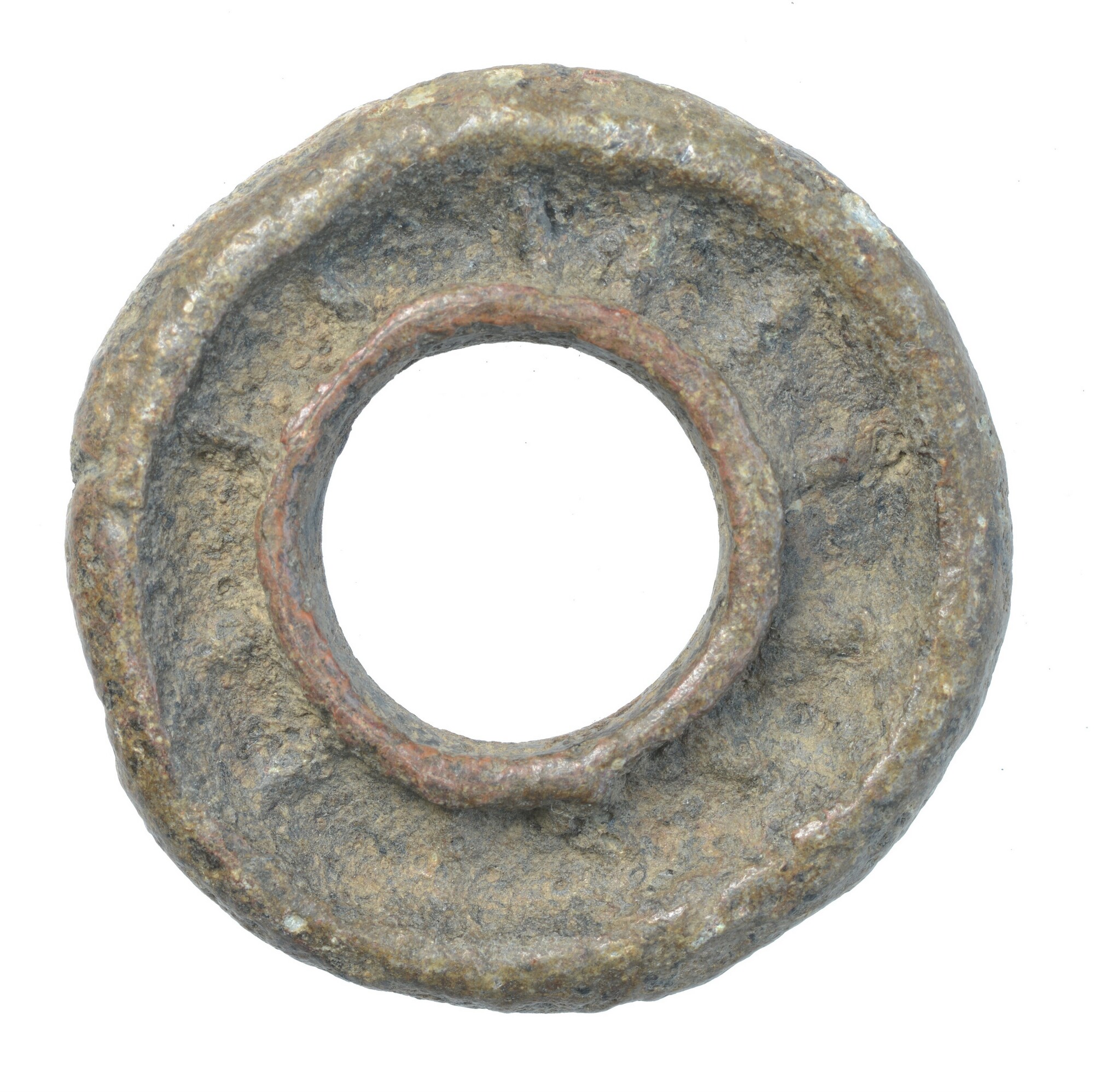 Spinlood; ronde platte schijf met in het midden een gat van 13 mm in diameter. De schijf is aan weerszijden versierd met een soort geometrische versiering van onregelmatige streepjes haaks op het gat