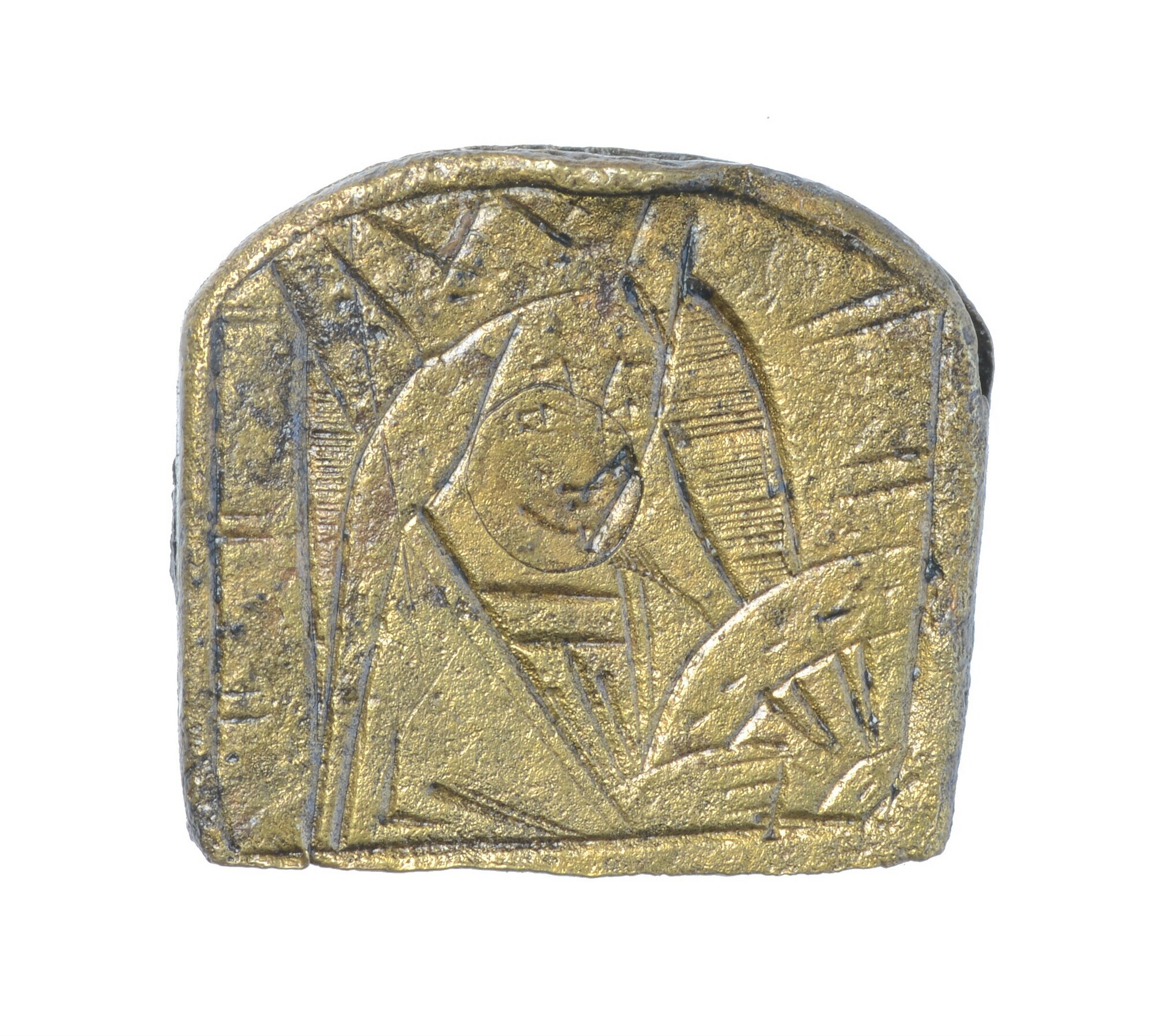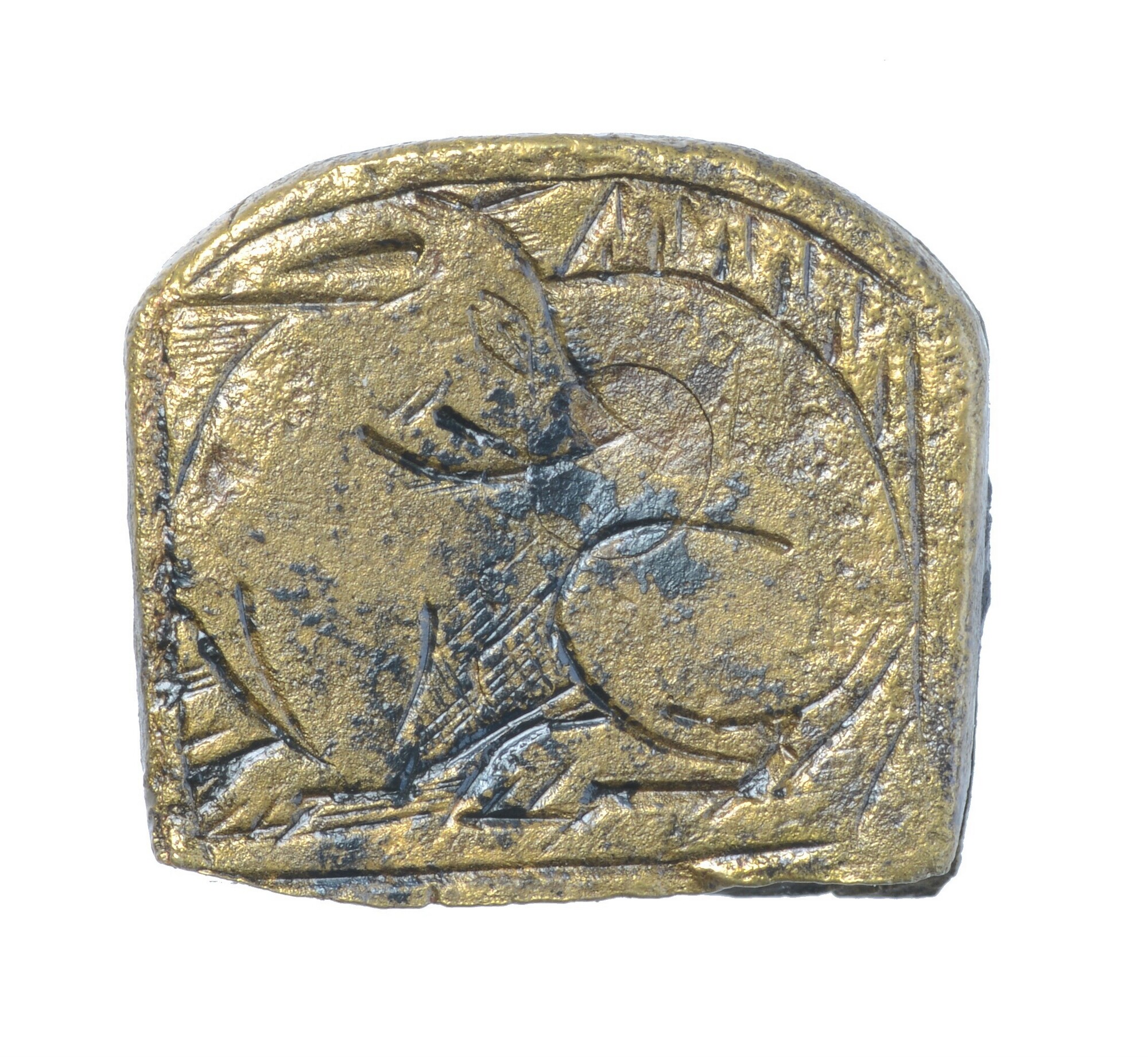 Heftbekroning; op de ene zijde is een vos ingegraveerd en op de andere zijde een vrouw