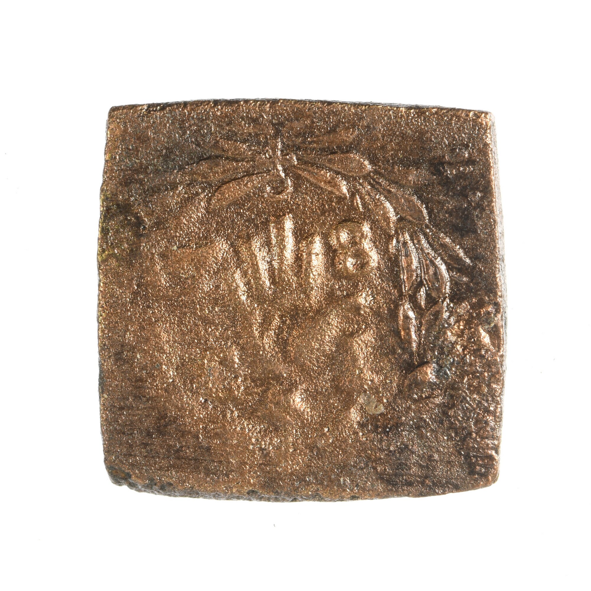 Muntgewicht; Willemsschild (1411-1417); vz.: koning zittende op een troon met zwaard in hand en letter G; kz.: binnen bladerkrans hand met aan weerszijden 7 - 8 en C - I; vervaardiger: Cornelis Janssen; herkomst: Antwerpen; gewicht: 3.23 gram