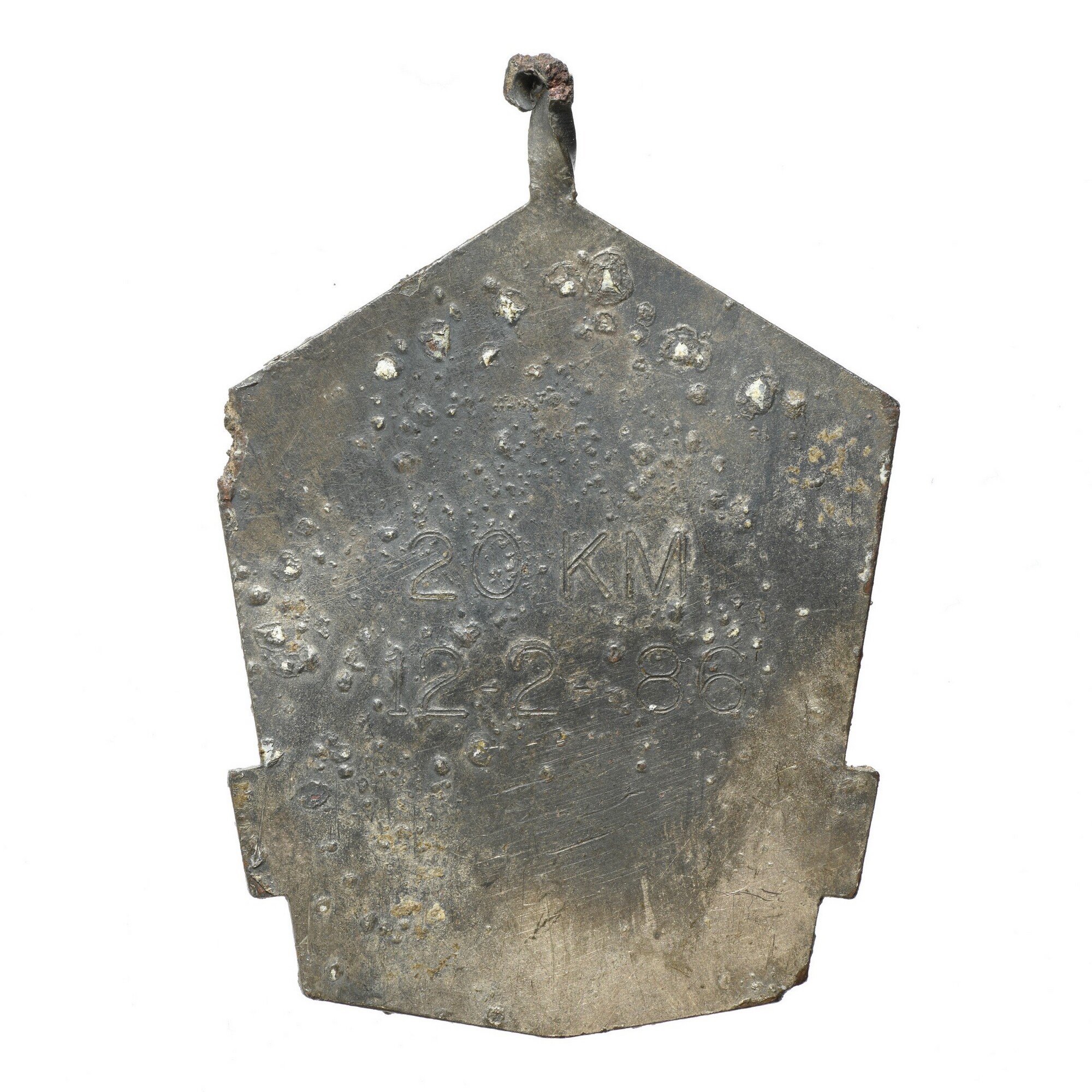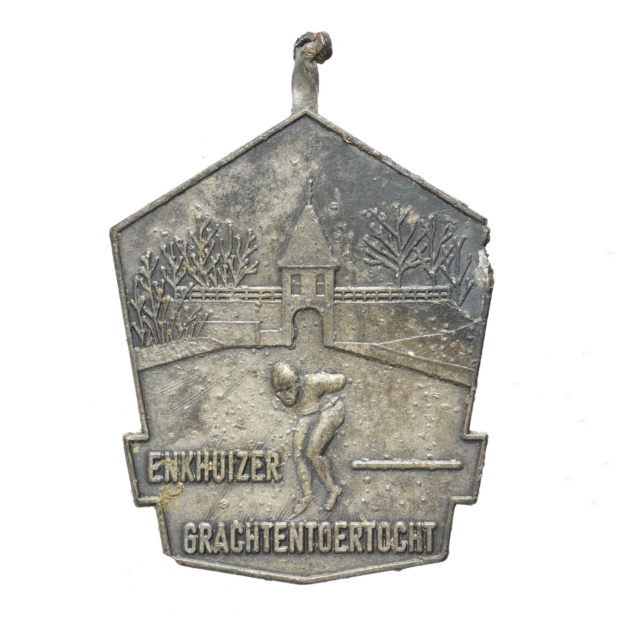 Medaille; bovenop een klein staafje met rond gat; vz.:op de achtergrond bomen en een courtine met sluishuis over een kanaal, vermoedelijk De Oude Gouwsboom, en op de voorgrond een schaatser op de buitengracht met daarnaast- en onder ENKHUIZER / GRACHTENTOERTOCHT; kz.: in twee regels 20 KM / 12-2-'86