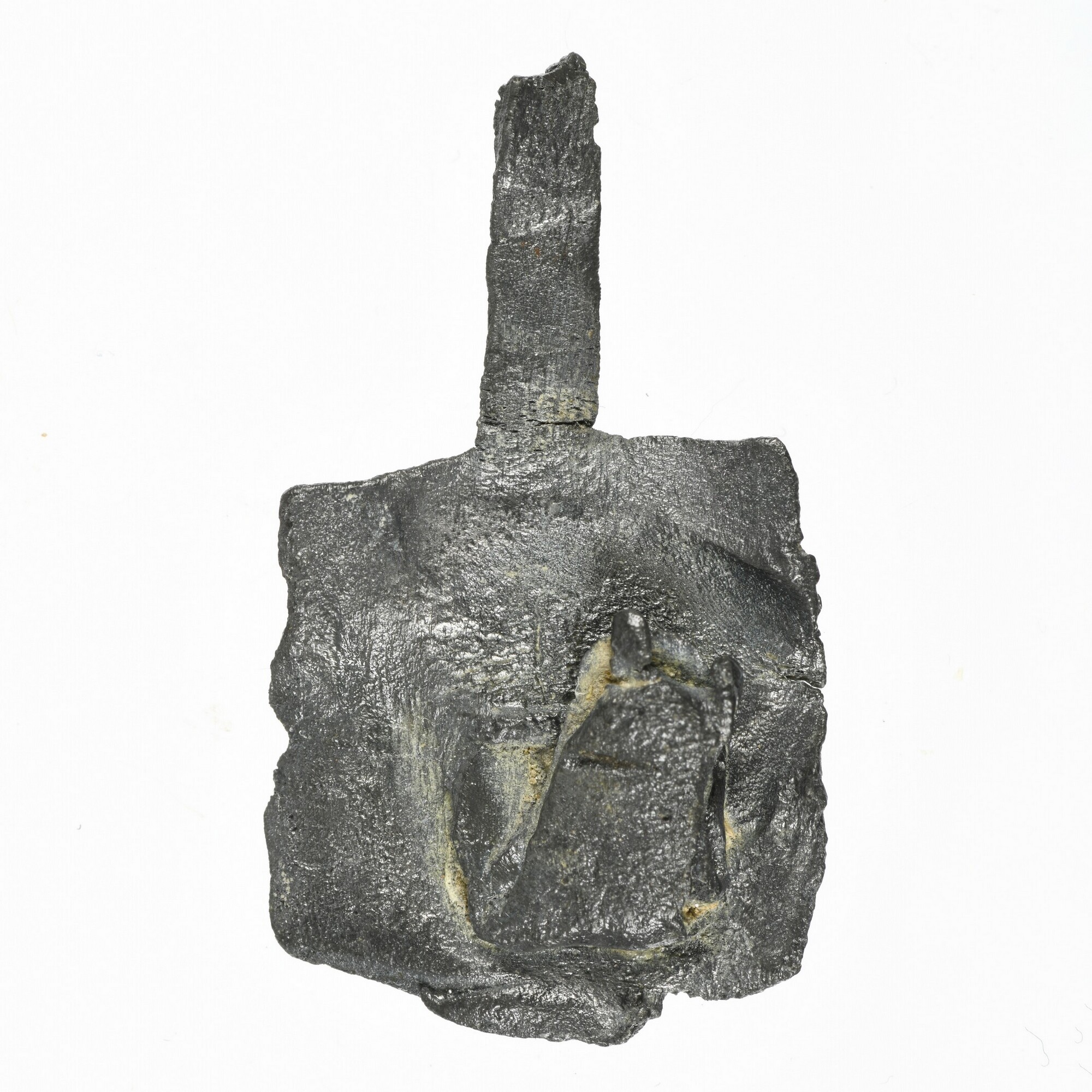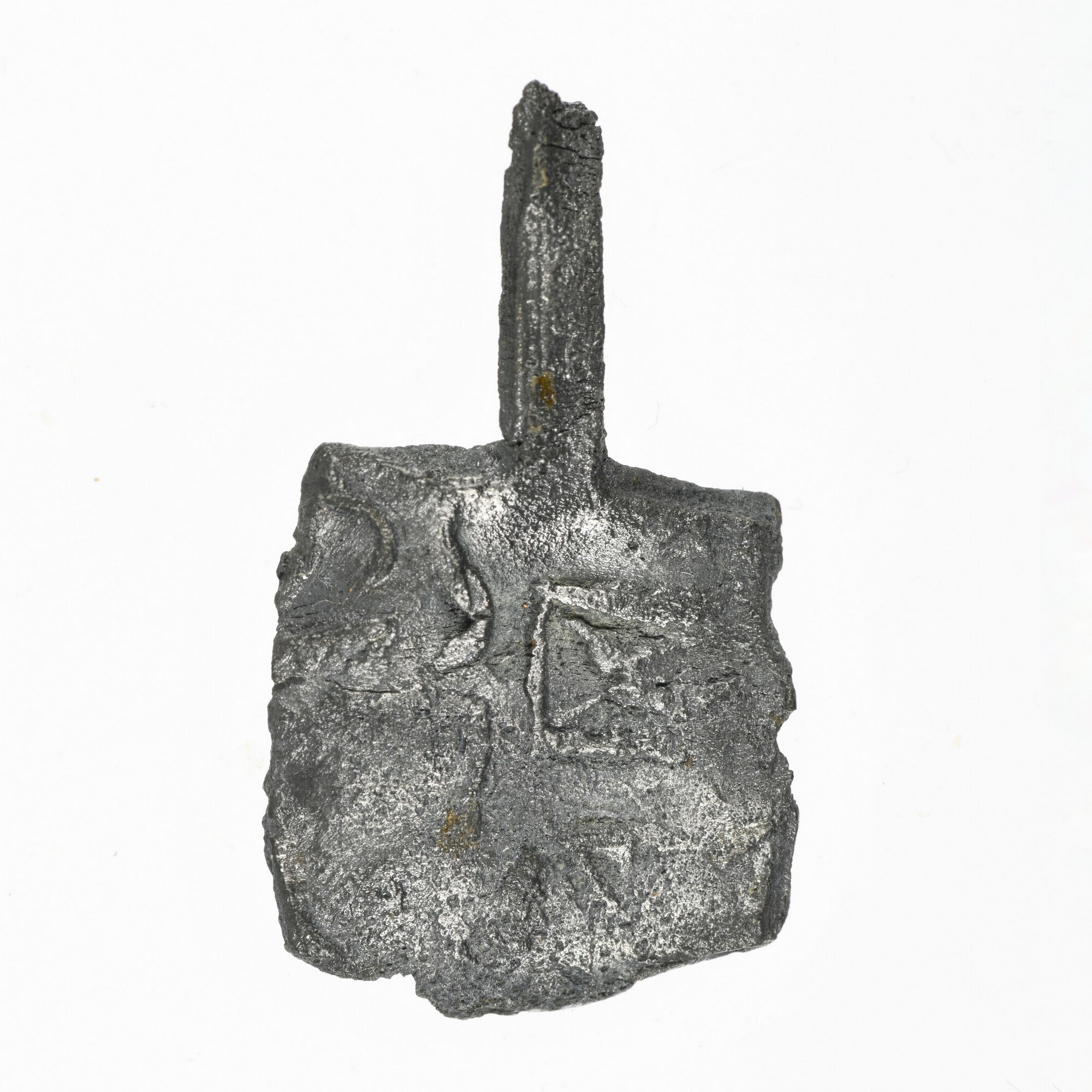 Haringnetlood; vierkant; vz.: twee rechthoekige zandloper met kruisen boven en een rechthoekige zandloper met kruis en letters D S?; kz.: ontbreekt; herkomst: Schiedam