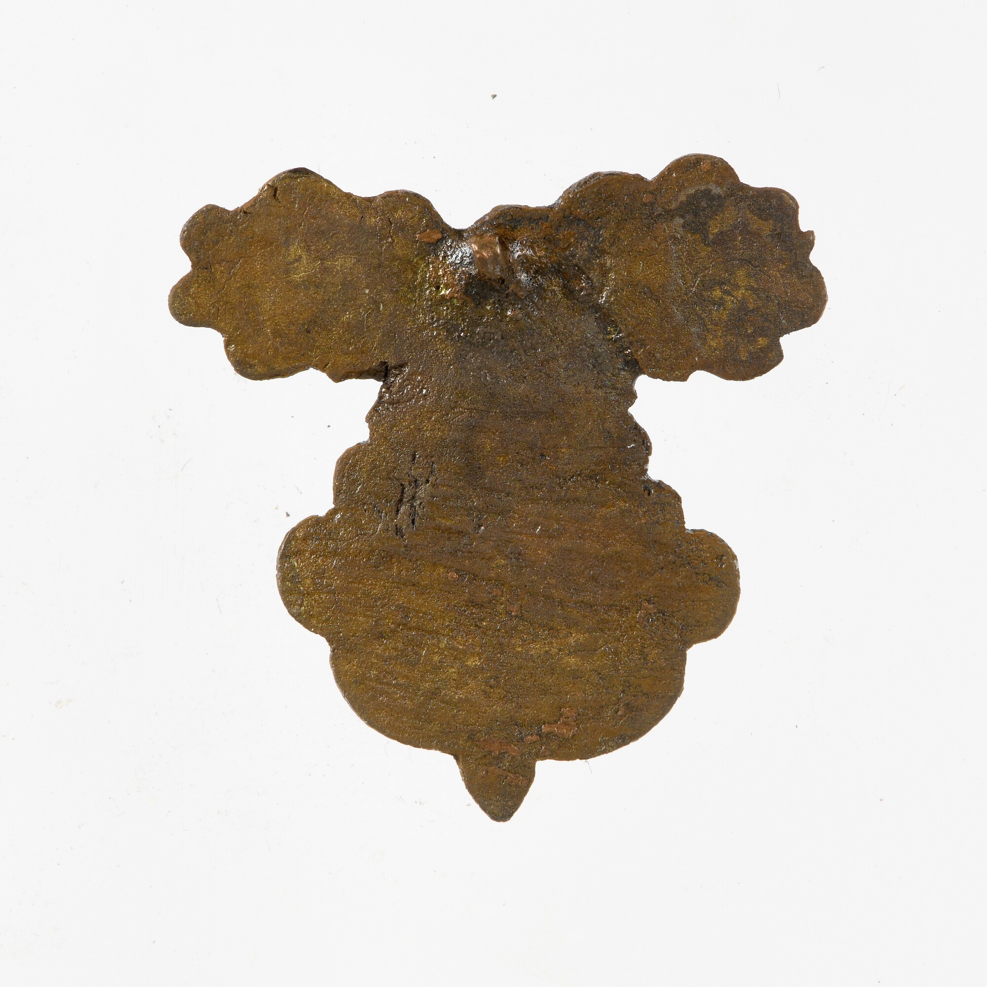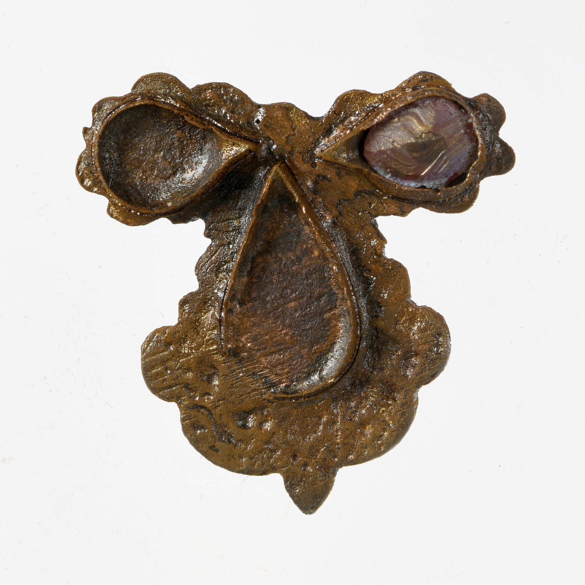 Speld?; broche?; bladvormig; vz.: drie druppels, met in een paars-bruin stuk glas; kz.: bevestigingspunt