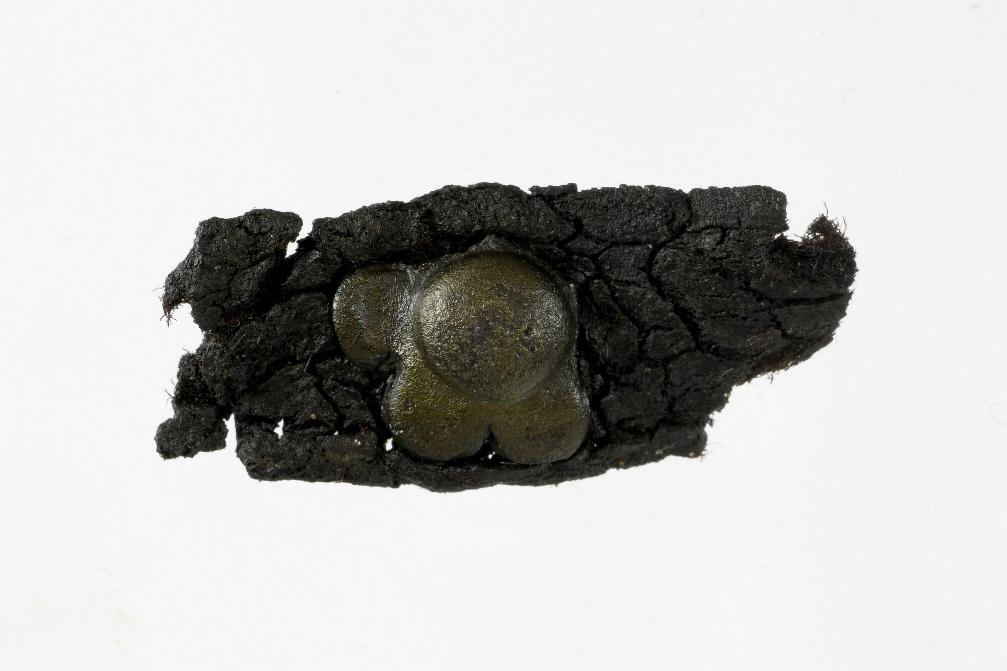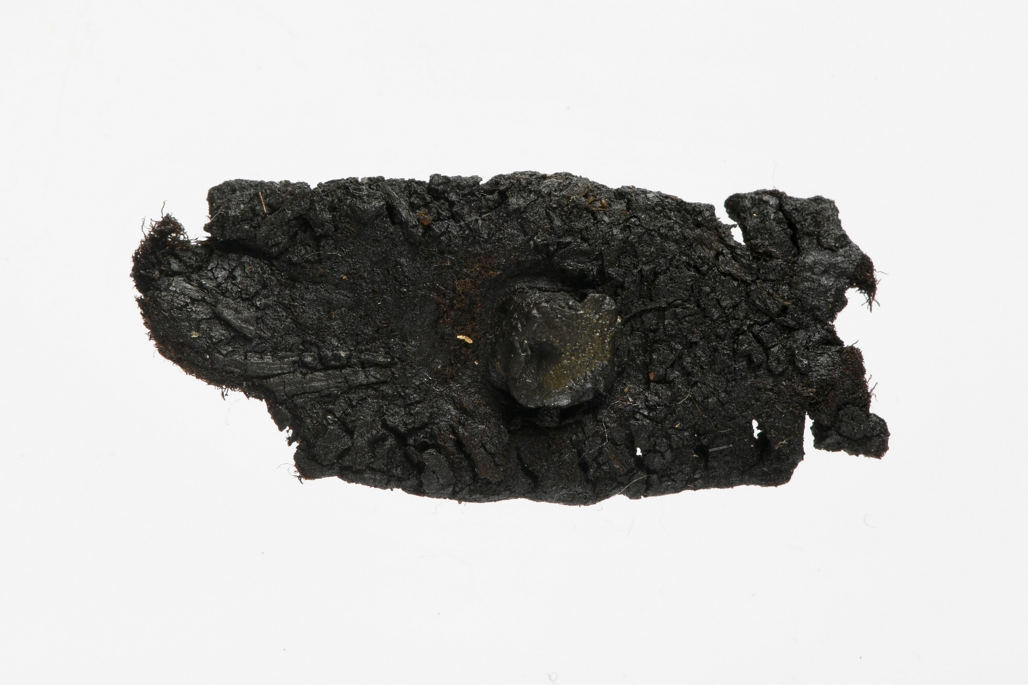 Riem; stukje leren riem met bloemvormig beslag; enkele naaigaten aan een zijkant