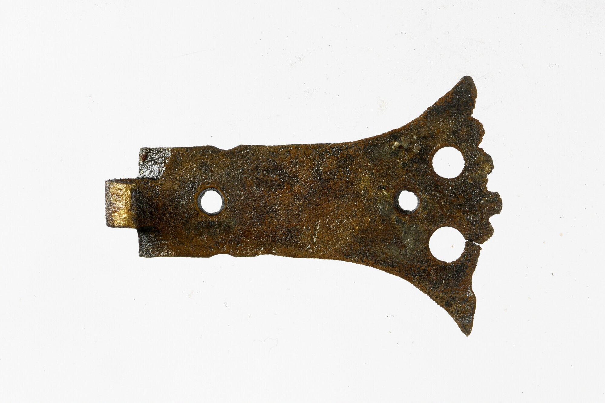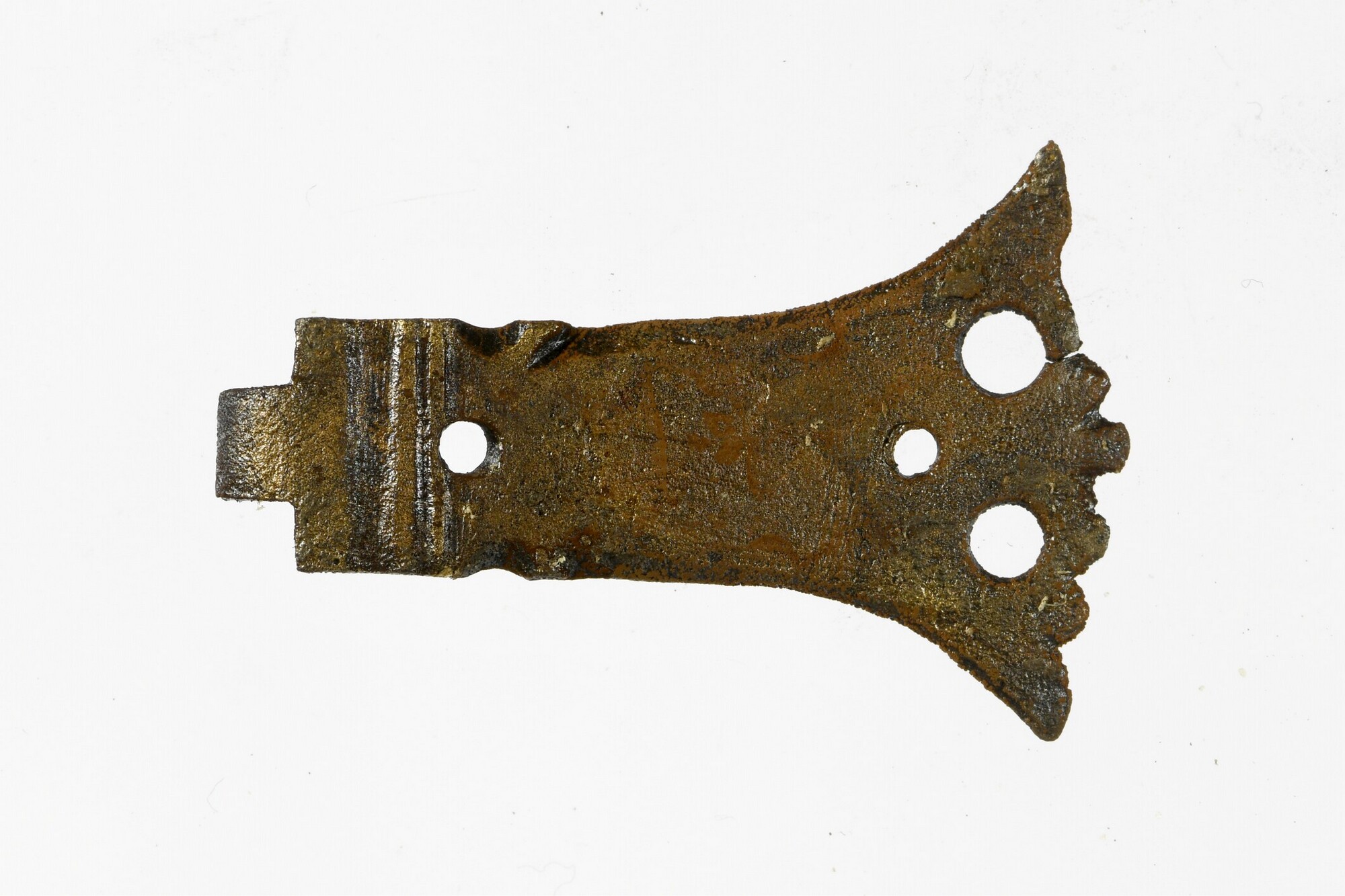 Boekbandsluiting; sluithaak; twee bevestigingsgaten; twee sierboorgaten; versierd met enkele verticale lijnen bij sluithaak en enkele ingekraste gebogen verticale lijnen nabij bevestigingsgat;