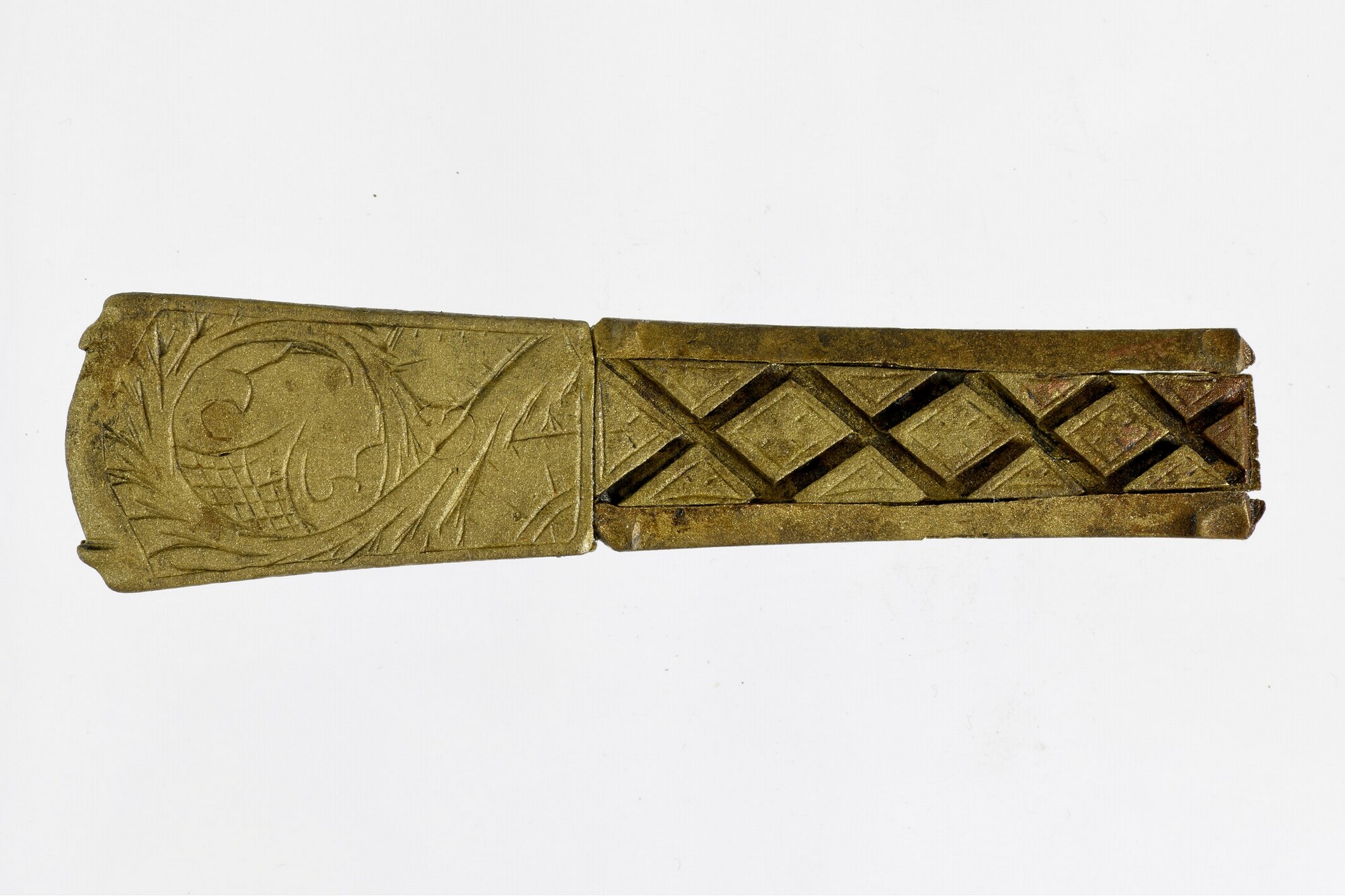 Mesheft; ijzeren lemmet binnenin; vz.: diep driehoeken- en ruitenmotief en op bekroning een banderol rond een tak met opschrift A * * V O; kz.: diep driehoeken- en ruitenmotief en op bekroning bladmotief