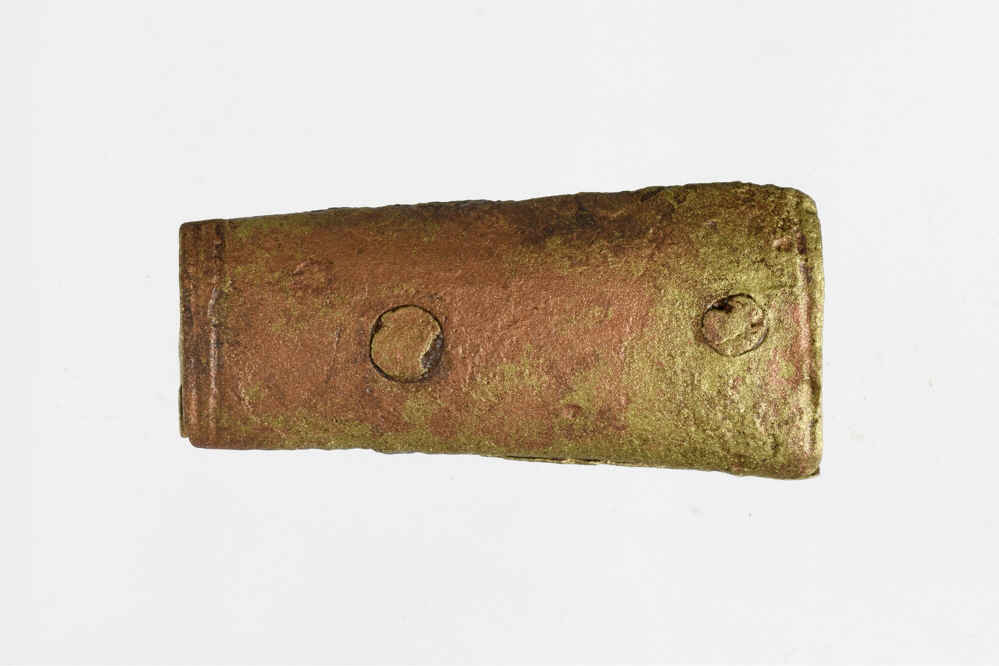Mesheft; twee plaatjes, bevestigd met twee nagels; resten ijzeren lemmet rond nagel; dubbele lijn bij uiteinde