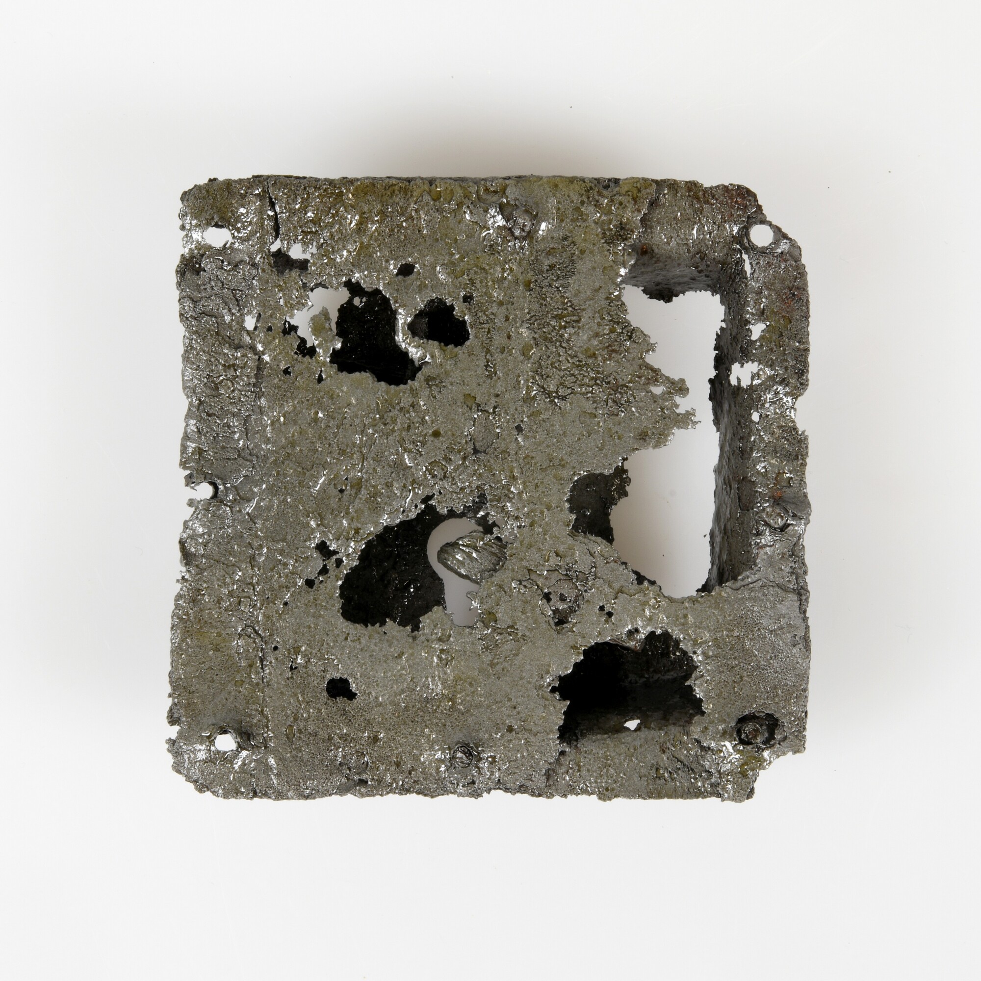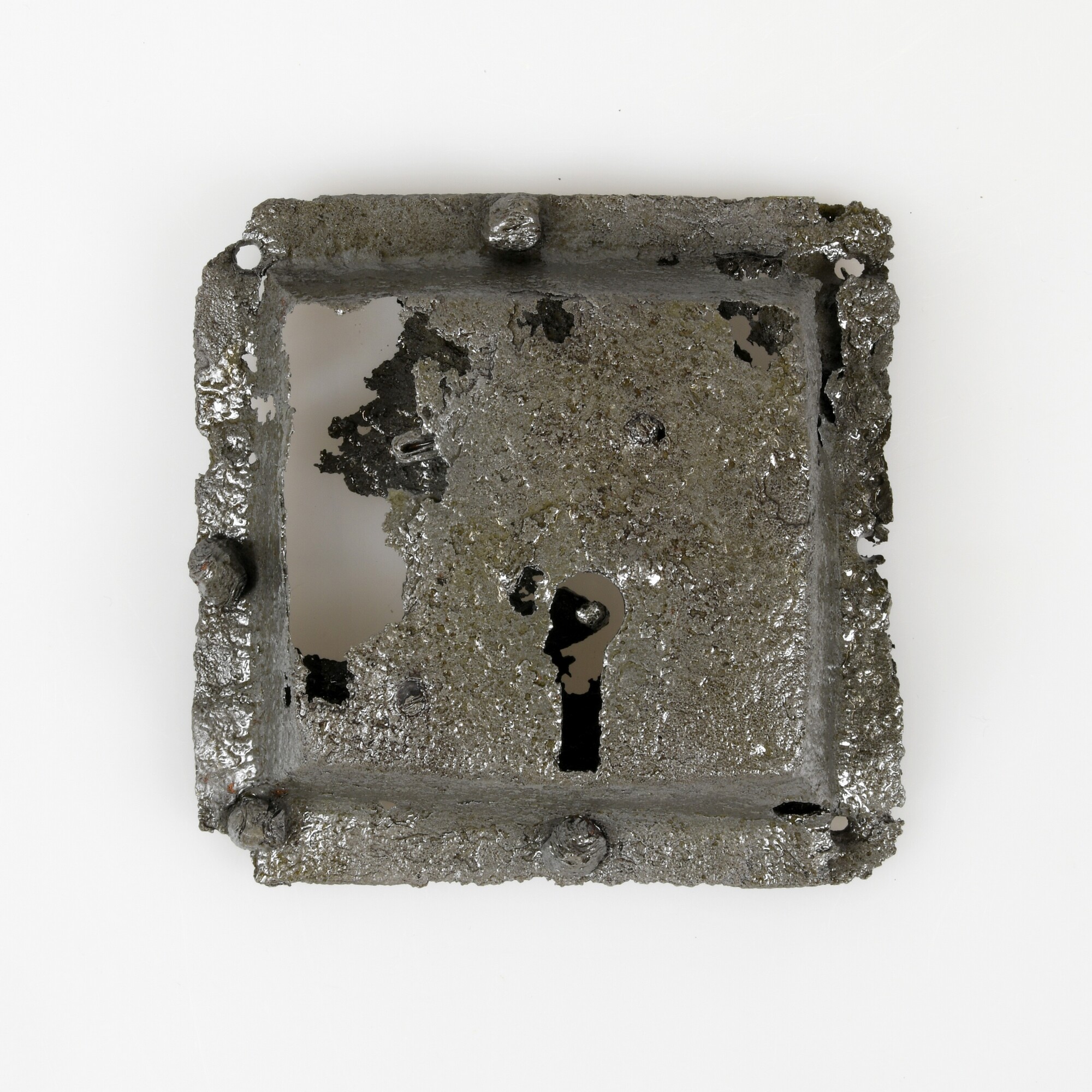 Hangslot; deurslot of kistslot; slotkast bestaande uit een vlakke achterplaat met daarop een vierkant uitgedreven voorplaat met sleutelgat verbonden met klinknagels; twee klinknagels in voorplaat
