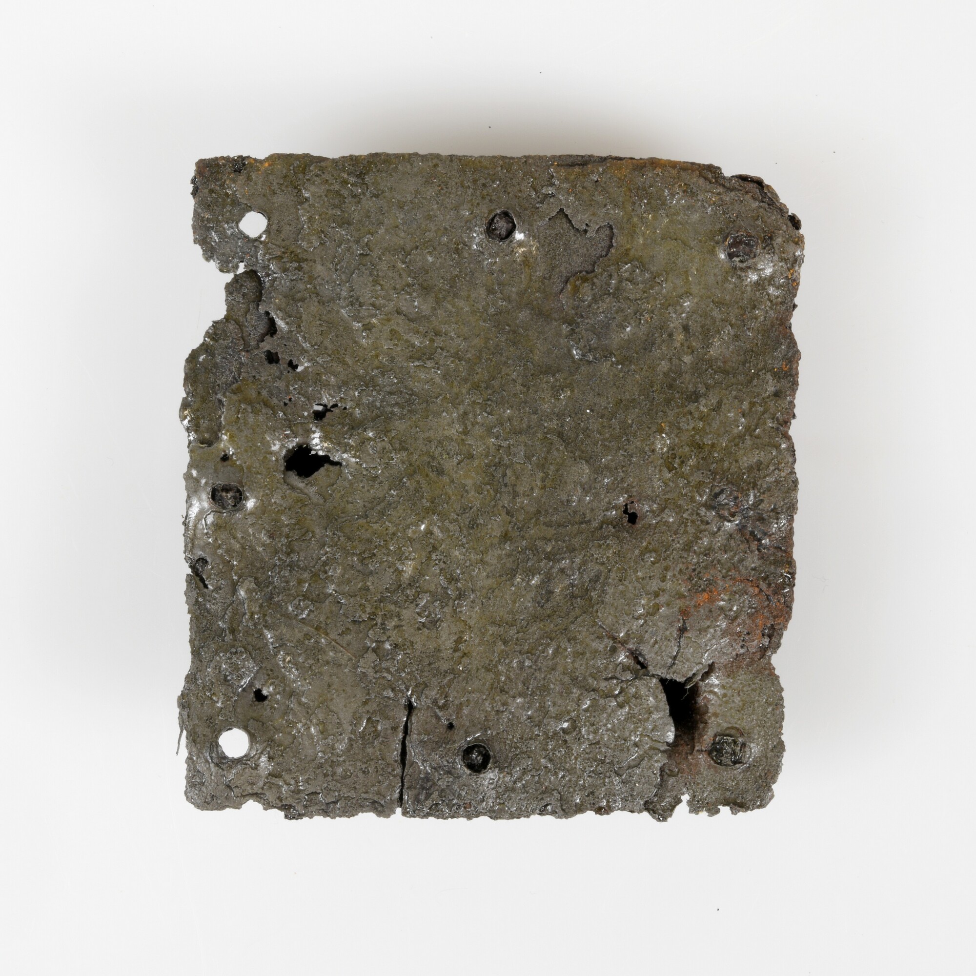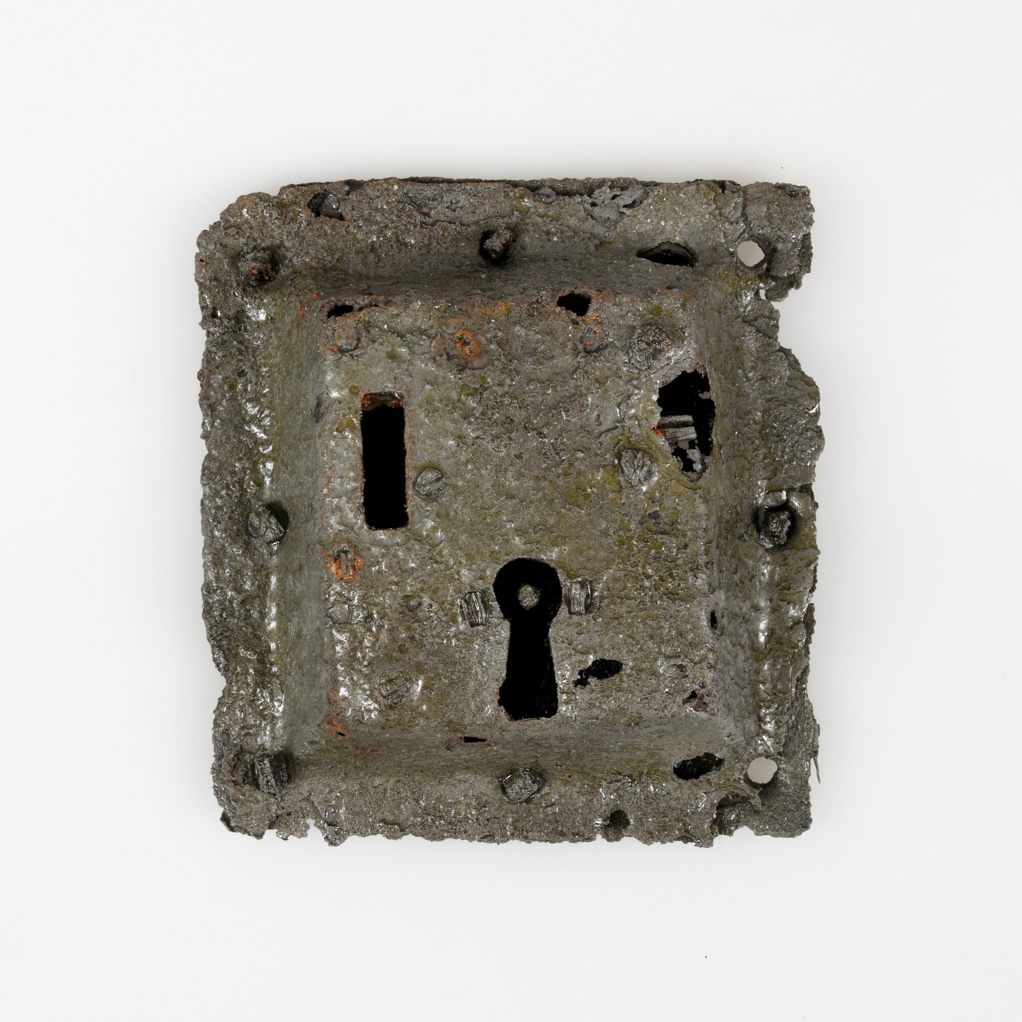 Hangslot; deurslot of kistslot; slotkast bestaande uit een vlakke achterplaat met daarop een vierkant uitgedreven voorplaat met sleutelgat verbonden met klinknagels; sleuf voorplaat; zes klinknagels in voorplaat